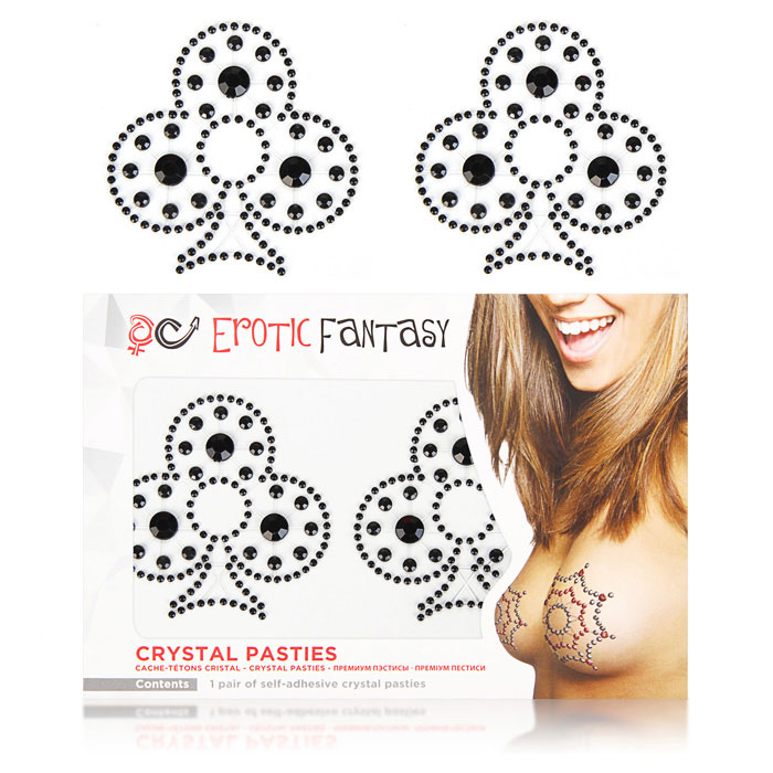Пэстисы-наклейки на грудь из черных переливающихся кристаллов, выложенных в форме карточной масти треф. Очень яркий, стильный аксессуар который добавит сексуальности вашему образу. Используйте пэстисы для свидания в спальне, или когда выбираете платья и топы с глубоким декольте. Если вы выбрали эротичный образ - то особенно соблазнительно выглядят пэстисы в паре с сетчатым бельем. Выбирайте контрастные цвета, чтобы быть более яркой! Пэстисы на гипоаллергенной клейкой основе. Подробная инструкция внутри упаковки.