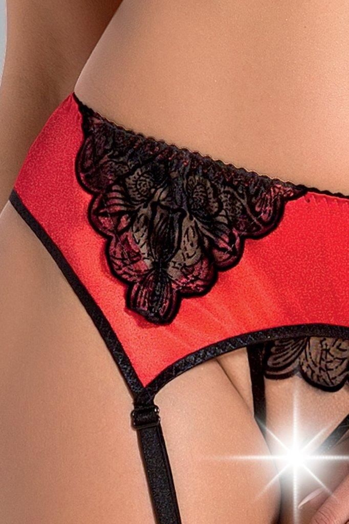 Комплект состоит из трёх частей, а именно бюстгальтера, пояса для чулок и стрингов. Выполнен из эластического сатина, красиво прилегающего к телу. Укрепленный косточками бюстгальтер красиво подчёркивает декольте, а пояс, украшенный чёрным кружевом, позволяет дополнить комплект чулками (приобретаются отдельно). В комплекте: бюстгальтер, пояс, трусики-стринги.