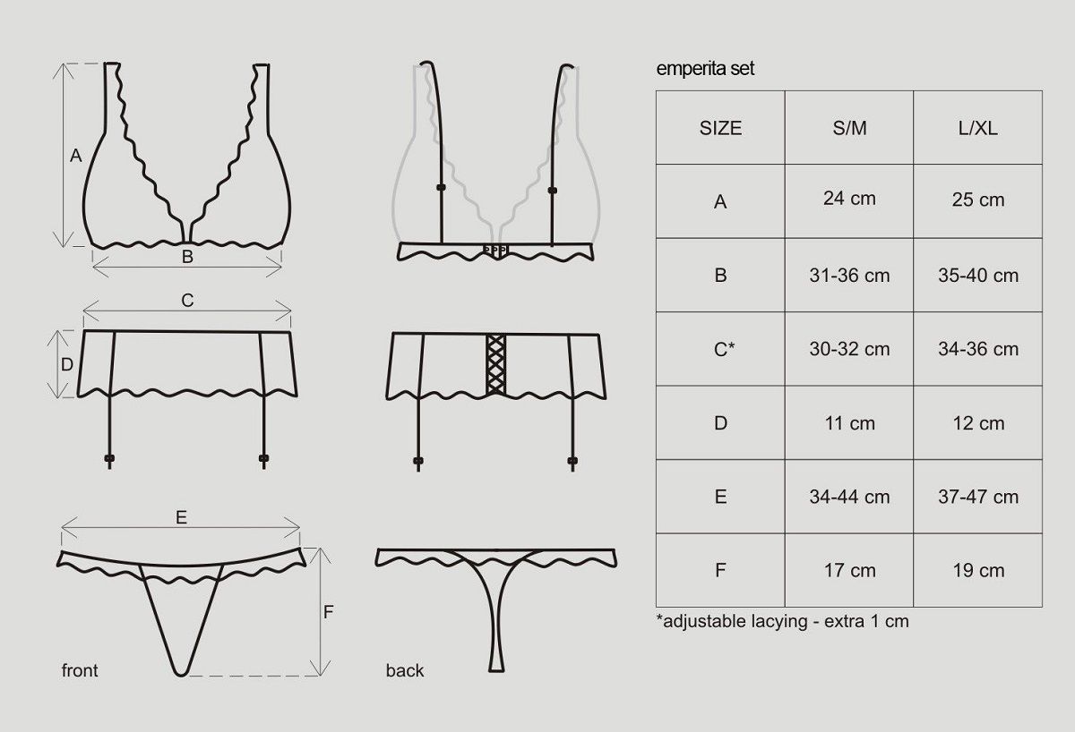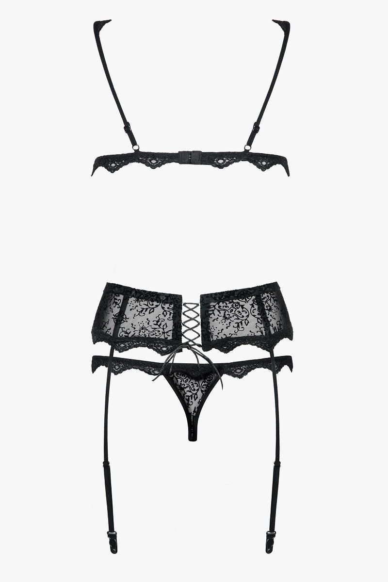 Сексуальный и элегантный комплект – идеально для вечера вдвоем! В комплекте три предмета: соблазнительный бюстгальтер, пикантный пояс для чулок и стринги. Все элементы комплекта украшены со вкусом узорами с цветочным мотивом и кружевной отделкой! Мягкий бюстгальтер с регулируемыми бретелями. Резинка под грудью и тройная застежка на крючки гарантирует комфорт и идеальную подгонку! Прозрачные чашки бюстгальтера декорированы орнаментами из велюра и кружевом. Широкий пояс для чулок с косточками, регулируемыми резинками и корсетной шнуровкой. Стринги с цветочным узором из велюра и кружевом. В комплекте: лиф, трусики-стринги, пояс для чулок.