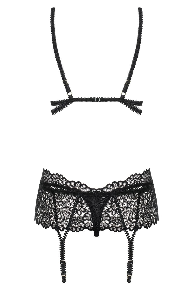 Роскошный комплект белья Mixty состоит из бюстгальтера, пояса для чулок и трусиков-стрингов. Комплект выполнен из эффектного кружева и эластичных лент. Лиф мягкий без косточек с регулируемыми бретелями и застежкой на спинке. В комплекте: бюстгальтер, пояс для чулок и трусики-стринги.