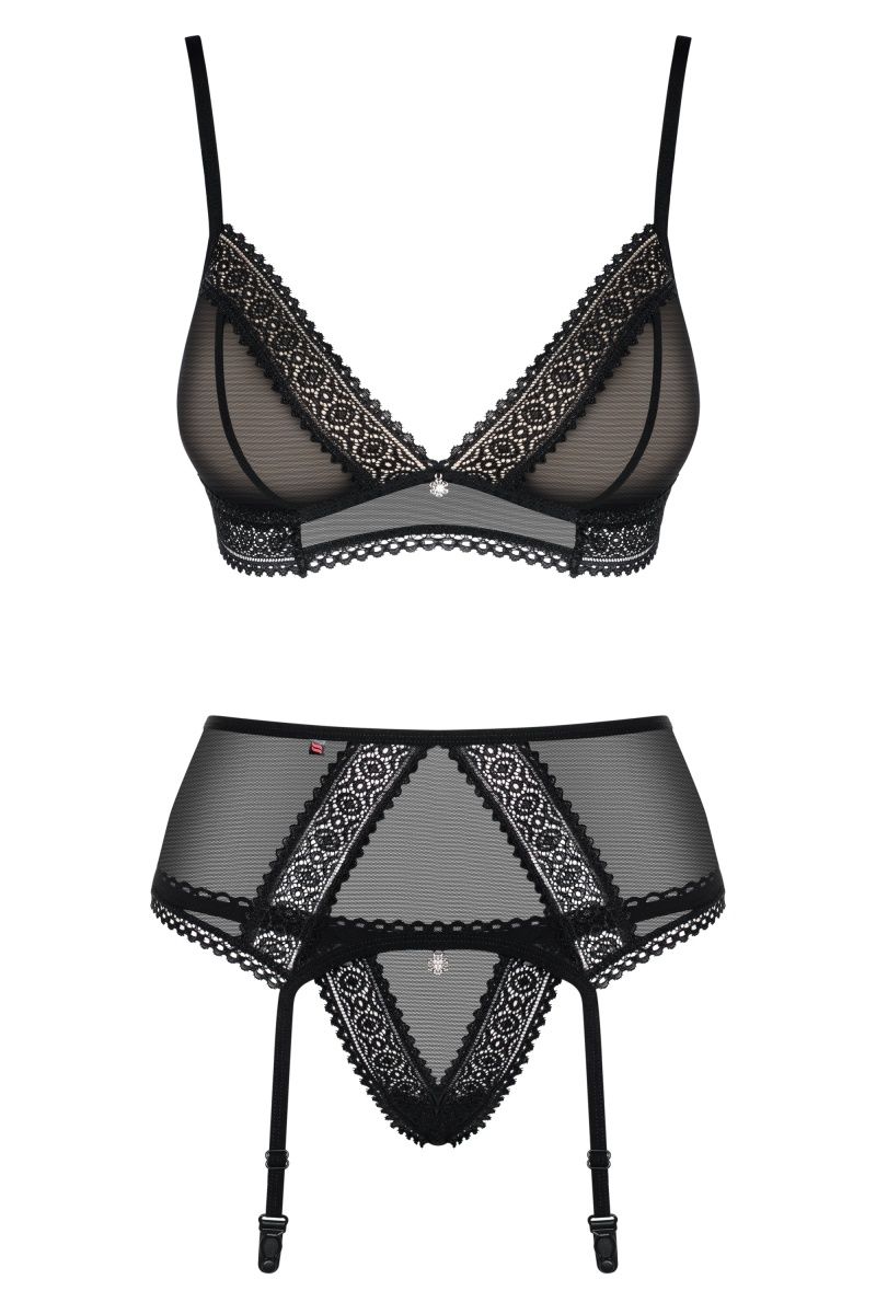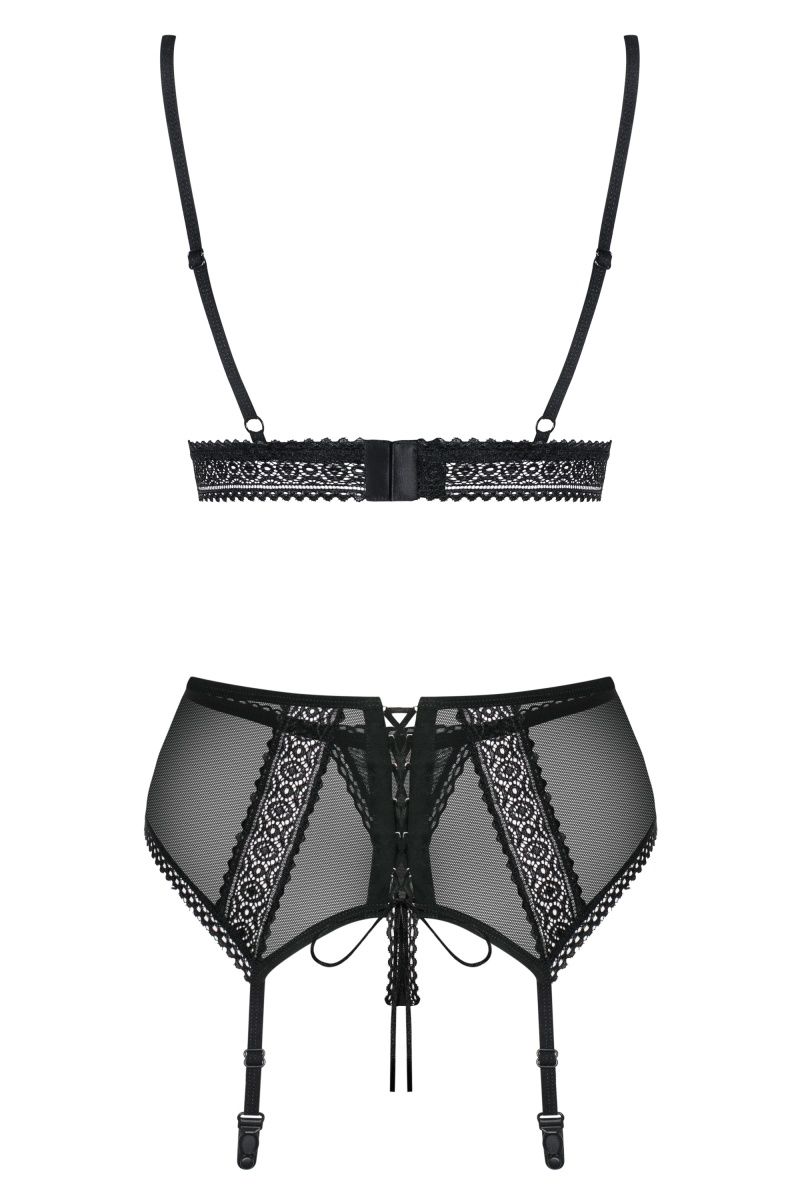 Комплект белья выполнен из полупрозрачной сеточки. Лиф с мягкой чашкой, бретели и застежка на спинке регулируются. Комплект декорирован кружевом. В комплекте: бюстгальтер, трусики-стринги, пояс для чулок. Чулки в комплект не входят!