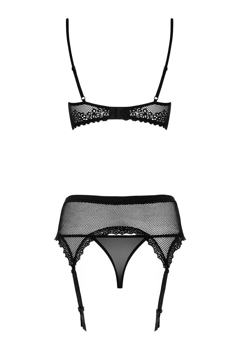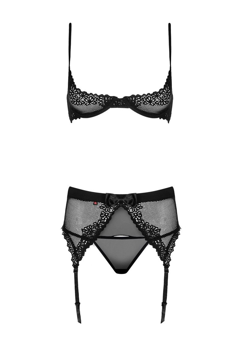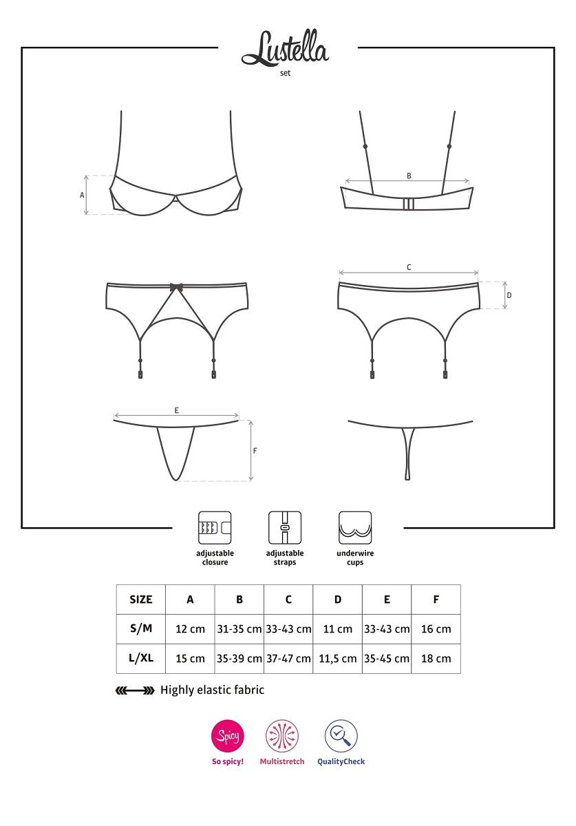 В комплект Lustella входят: бюстгальтер, почти полностью открывающий грудь, трусики и пояс для чулок. В комплекте: лиф, трусики-стринги, пояс.