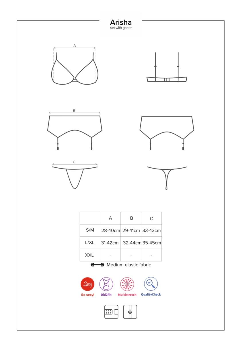 Роскошный комплект белья Arisha состоит из бюстгальтера, пояса для чулок и трусиков-стринг. Комплект выполнен из нежного эластичного материала в сочетании с красивым кружевом. Лиф мягкий без косточек, бретельки регулируются по длине, на спинке удобная застежка. В комплекте: бюстгальтер, трусики-стринги, пояс для чулок.