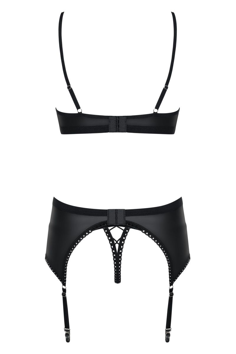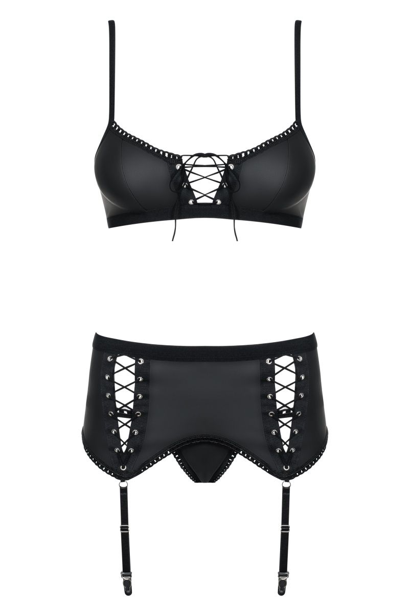 Роскошный комплект белья Redella состоит из бюстгальтера, пояса для чулок и трусиков. Комплект выполнен из эластичной эко-кожи. Лиф мягкий без косточек с регулируемыми бретелями и застежкой на спинке. Комплект декорирован шнуровкой. В комплекте: бюстгальтер, трусики-стринги, пояс для чулок.