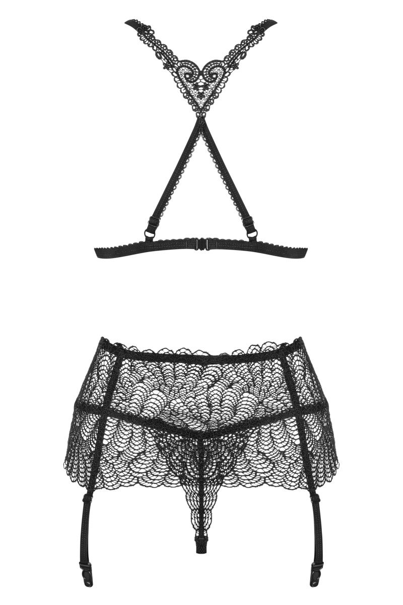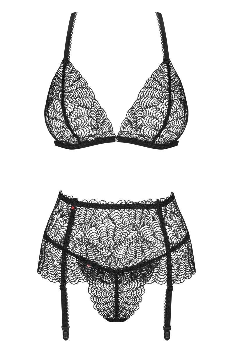Роскошный комплект Сhiccanta выполнен из ажурного кружева. Бюстгальтер с мягкой чашкой без косточек, бретельки регулируются по длине, на спинке застежка. В комплекте: бюстгальтер, трусики-стринги, пояс для чулок.