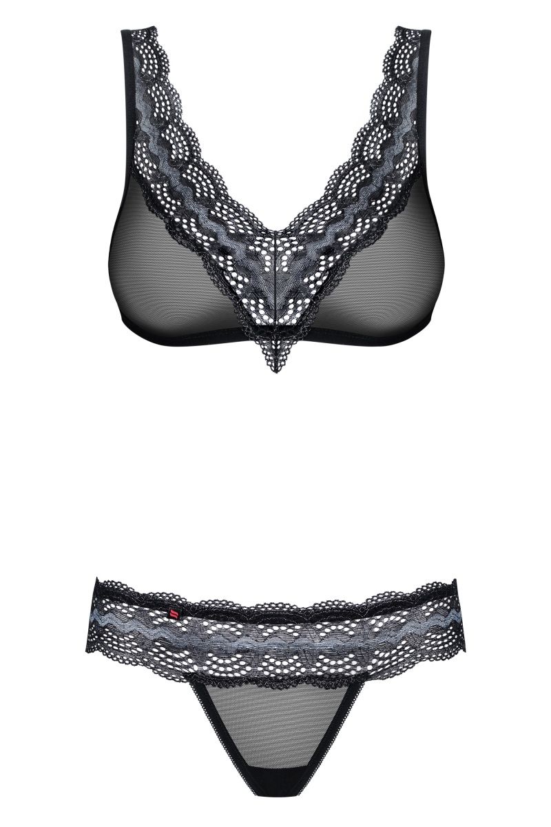 Комплект белья выполнен из полупрозрачной сетки и элегантного кружева. Лиф с регулируемыми бретелями, на спинке застежка. В комплекте: бюстгальтер и трусики.