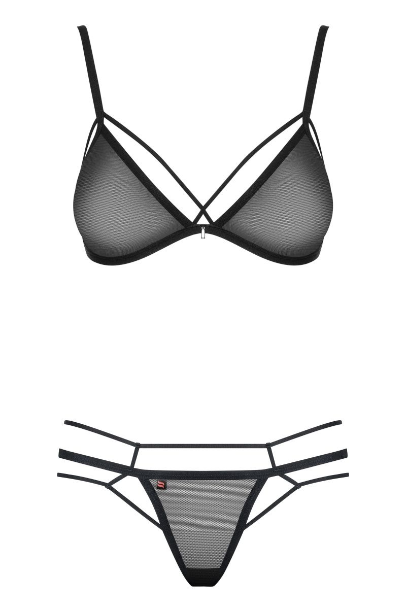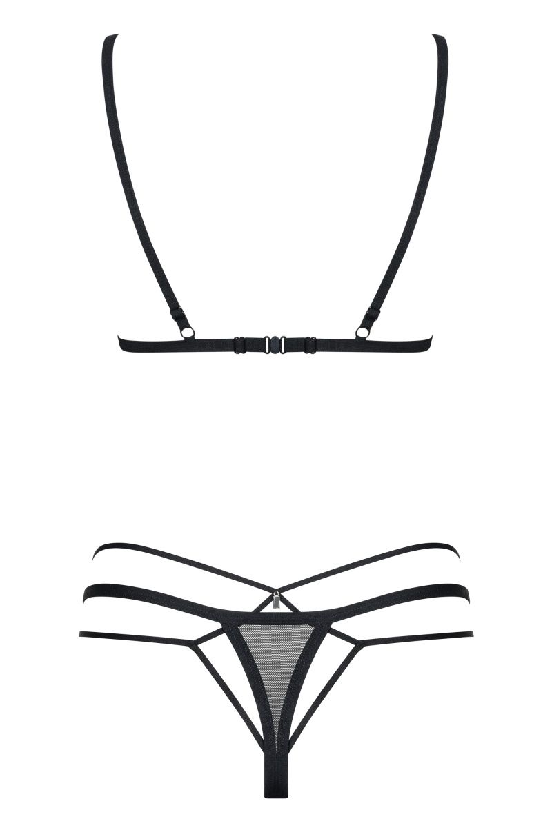 Комплект белья выполнен из полупрозрачной сетки. Лиф с регулируемыми бретелями, на спинке застежка. Комплект декорирован мягкими стреп-лентами. В комплекте: бюстгальтер и трусики-стринги.
