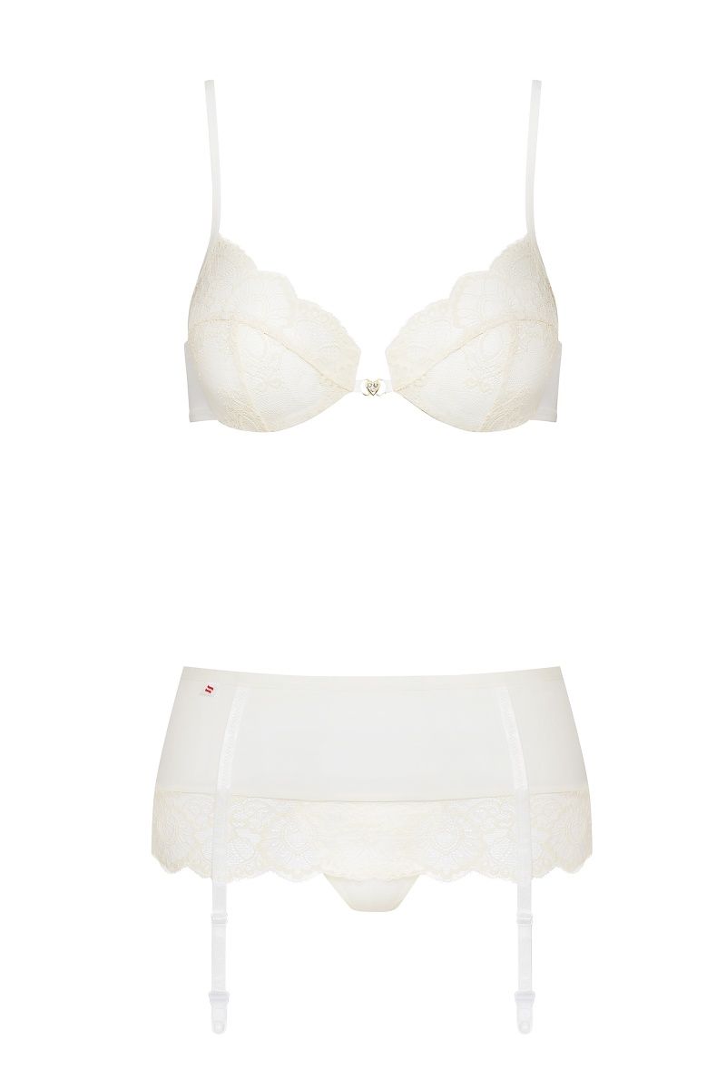 Полупрозрачный кружевной комплект выполнен из нежной ткани. Бюстгальтер с мягкой чашечкой на косточках в сочетании с трусиками дополнен широким роясом для чулок. В комплекте: бюстгальтер, пояс для чулок и трусики-стринги.