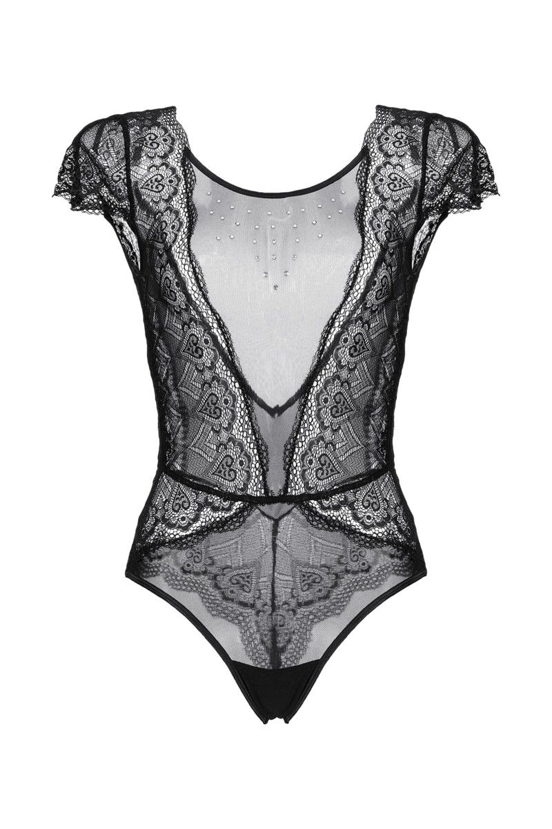 Боди приталенного силуэта из эластичной сетки с шикарными кружевными вставками, открытой спиной, миниатюрными рукавами. Декольте украшено россыпью страз.