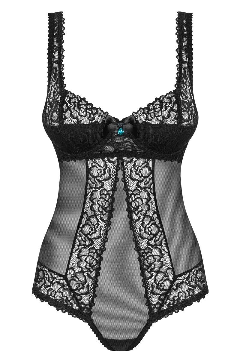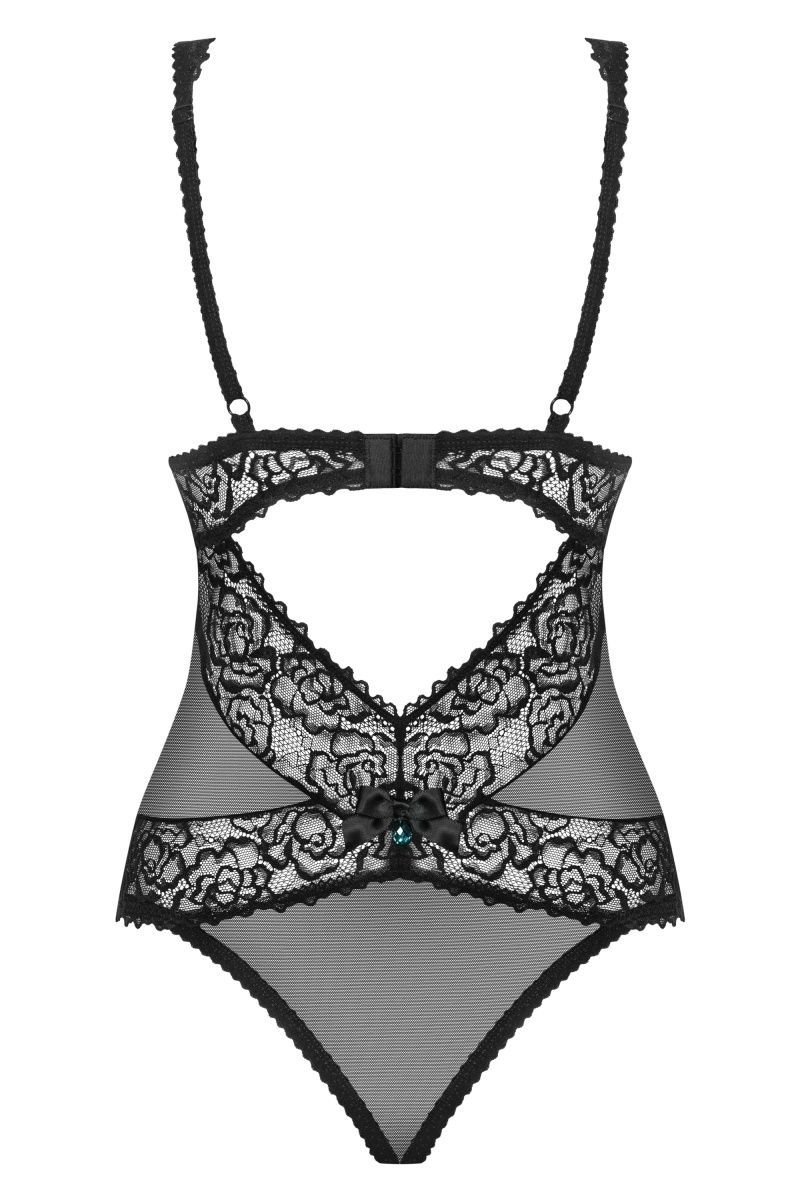 Полупрозрачное боди выполнено из эластичной сеточки в сочетании с красивым кружевом. Боди с чашкой на косточках, на спинке регулируемая застежка.