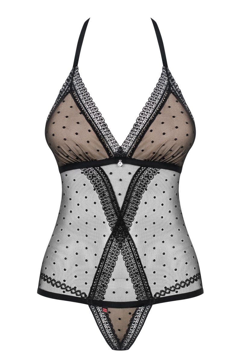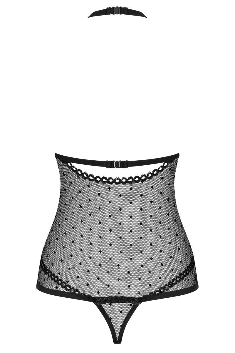 Полупрозрачное боди в мелкий горошек. Боди с мягкой чашкой, бретель фиксируется за шеей, на спинке регулируемая застежка.