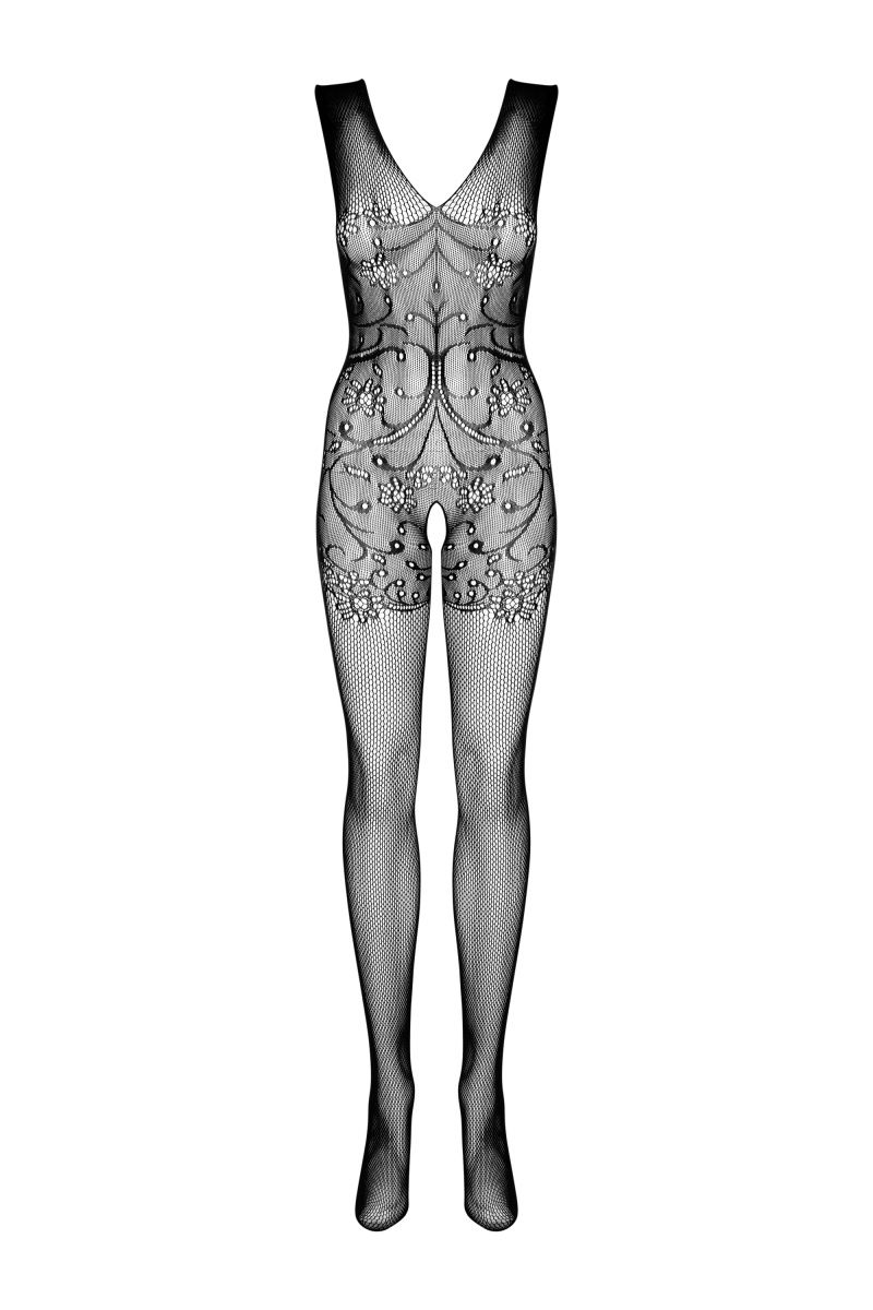 Игривый чулок на тело с невероятно женственным плетением. Комбинезон на широких бретелях выполнен из крупной сетки в зоне декольте. Под грудью, на талии и бедрах украшен нежным узором с цветочным орнаментом. Низ также изготовлен из крупной сеточки.