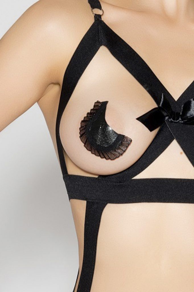 Изящный наряд выполнен из эластичных широких черных полос. Пажи позволяют создавать различные образы с использованием чулок. Наряд идеально показывает все чувственные изгибы тела. Черный атласный бант призывает раскрыть «упаковку» и узнать, что же кроется под ней.Создай свой индивидуальный образ!