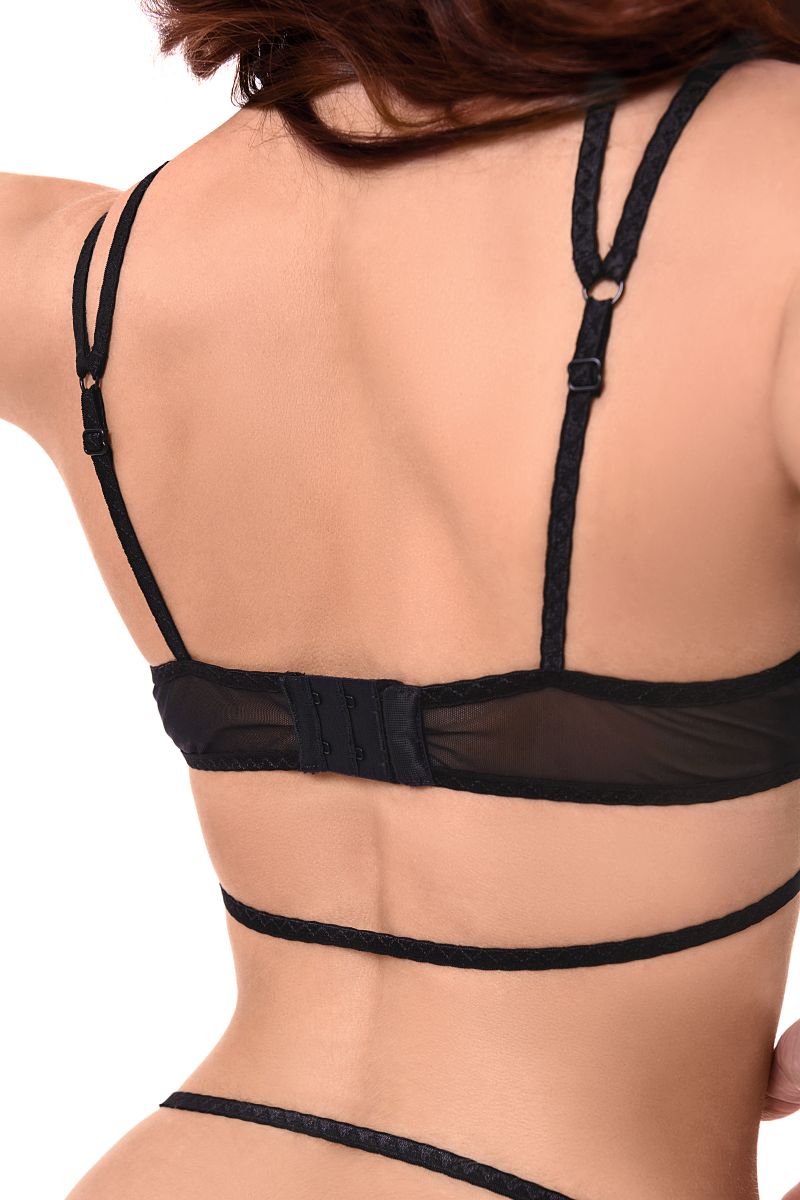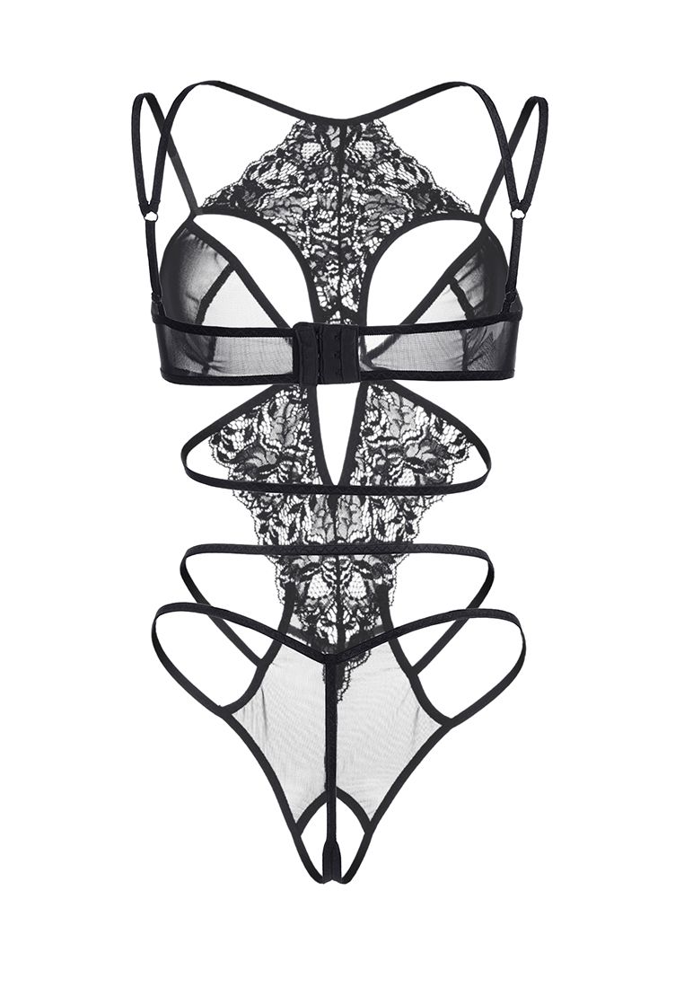 Эротическое боди из эластичной сетки со вставками кружева со свободным краем. Фигурные вырезы открывают верхнюю часть груди. Регулируемые бретели и застежка на спине. Допускается замена кружева на аналогичное.