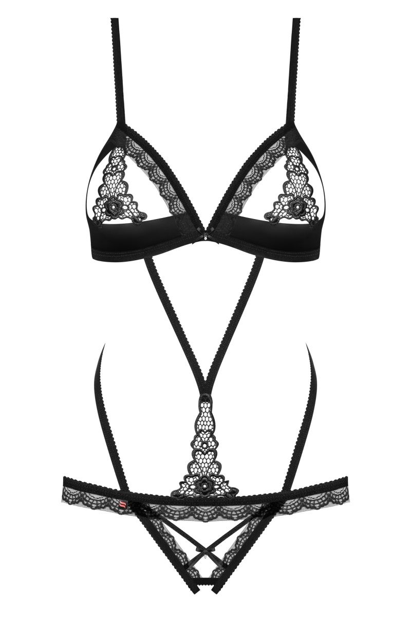 Оригинальное контактное боди. Открытый лиф декорирован вставкой из кружева, бретели регулируются. Верхняя и нижняя часть боди соединена тонкими резиночками-стрепами.