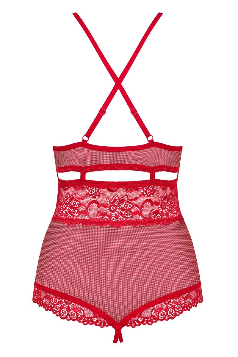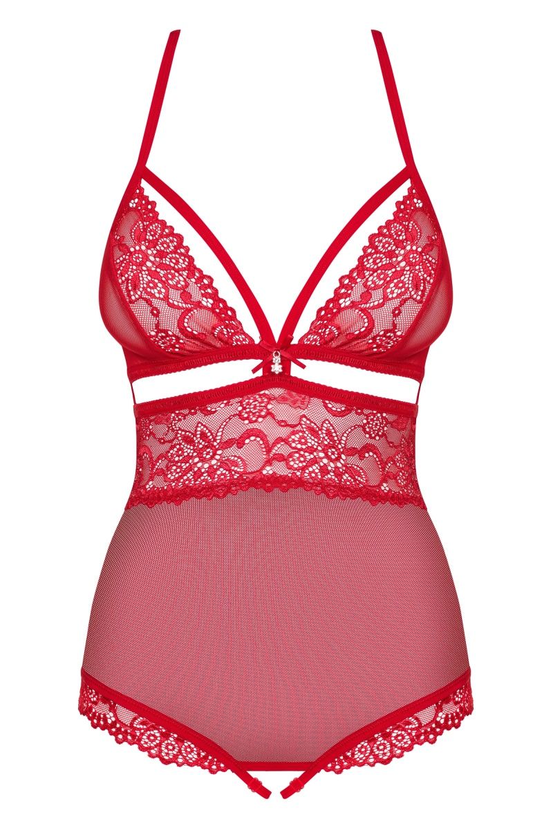 Полупрозрачное боди с доступом, украшено кружевом. Бретели крест на крест, регулируютcя по длине.