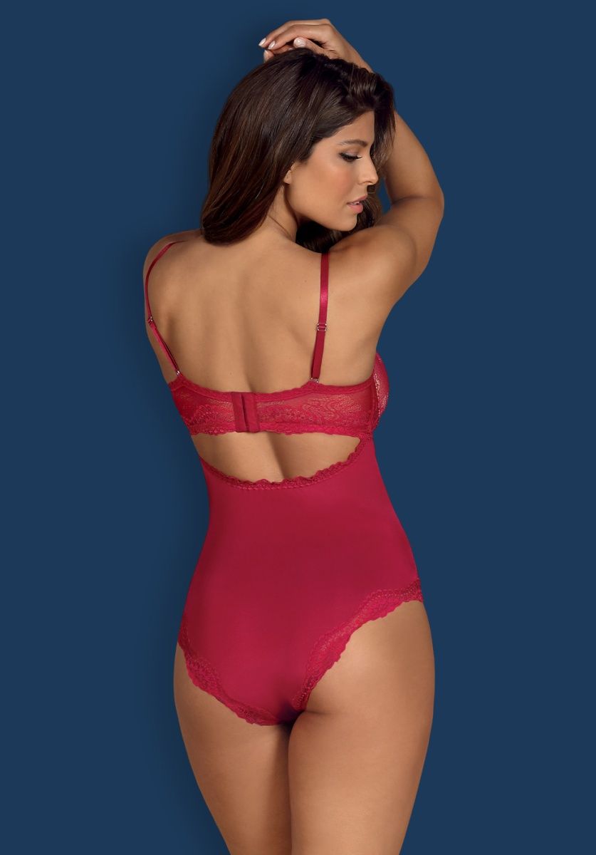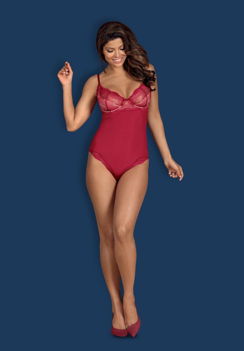Женское боди из гладкой эластичной ткани. Модель предназначена для обладательниц пышного бюста. Чашечки на косточках с поролоном в нижней части поддерживают и приподнимают грудь. Узорчатое кружево сверху украшает боди. Между чашечками красуется атласный бантик. Кокетливый вырез на спинке расшит кружевной оборкой. Низ изделия украшен кружевной оборкой. Бретели регулируются по длине.