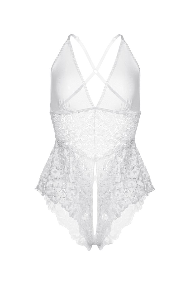 Боди Senna с прозрачным лифом, перекрестными регулируемыми бретелями и кружевными оборками подчеркнет ваше нежное романтичное настроение. Легкий перламутровый блеск окантовки и кружева выгодно оттенит естественный цвет кожи.
