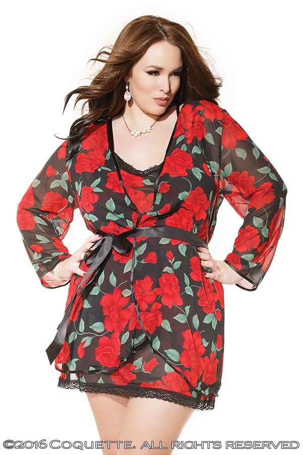 Черный халатик из нежного и мягкого полупрозрачного материала с принтом ярких роз. Края полочек обшиты атласом, в комплекте широкий гладкий поясок.