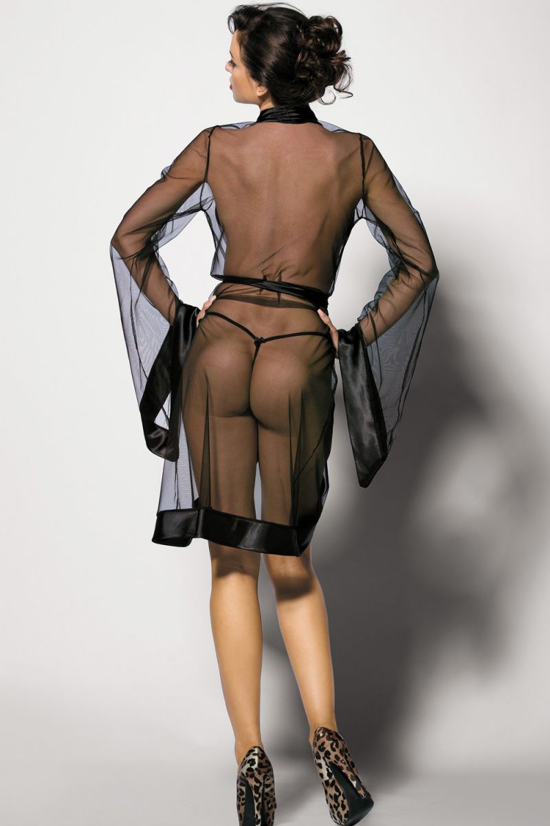 Роскошный пеньюар поможет Вам создать страстный образ королевы ночи. Пеньюар выполнен из тончайшего невесомого шифона. Ворот, полочки, подол и рукава окантованы широкой лентой из мерцающего черного атласа. Широкий атласный пояс подчеркивает талию. Трусики-стринги в комплекте. В комплекте: пеньюар, трусики-стринги.