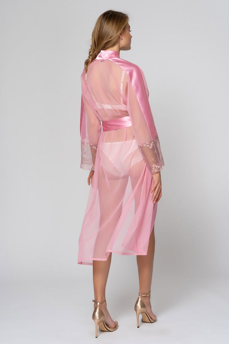 Легкий халатик выполнен из полиэстера высокого качества. Халат на запахе, свободного кроя для комфортной носки. Свободные длинные рукава декорированы микросеткой с оригинальной вышивкой. Края полочек и съемный пояс выполнены из атласной ткани. Лёгкий халат классического цвета настроит не только на отдых, но и более яркое продолжение дня.