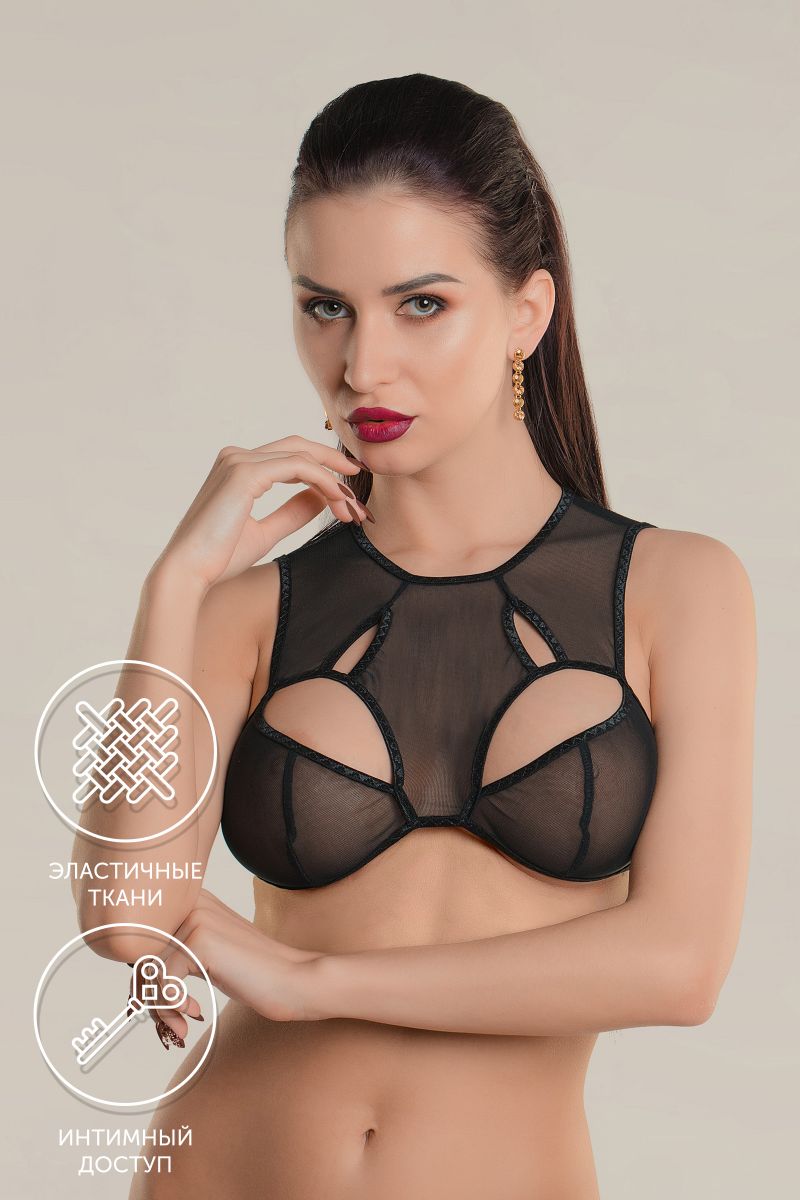 Бралетт с фигурными вырезами Delicacy из тонкой эластичной сетки эффектно облегает фигуру. Ощущается совсем невесомым, не сковывает движений, но визуально меняет силуэт. Шелковистая поверхность материала дарит приятные ощущения при прикосновении. А современные элементы дизайна бралетт тешат женское самолюбие. Фигурные вырезы притягивают взгляд к нежной коже бюста и зрительно добавляют полноту груди. Необычный крой, регулируемые бретели, застежка на шее и двухрядная застежка на спине обеспечивают идеальную посадку. Открытая спина – важная деталь чувственного образа.