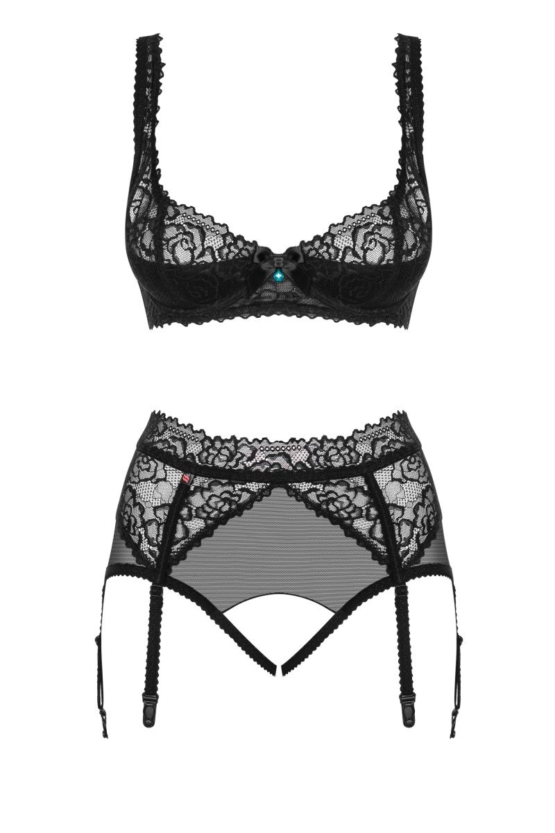 Эротический комплект белья состоит из бюстгальтера и трусиков-пояса с подвязками, выполнен из эластичной сеточки в сочетании с кружевом. Бюстгальтер на косточках. Бретели и подвязки регулируются по длине. В комплекте: бюстгальтер и трусики-пояс. Чулки в комплект не входят!