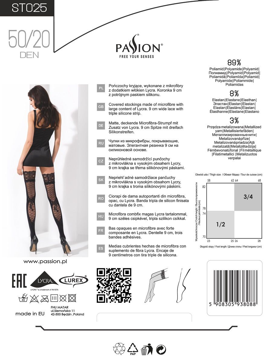 Чулки Passion станут элегантным дополнением к любому наряду, а в нужный момент подчеркнут страстность вашей натуры и помогут вскружить голову вашему кавалеру. Романтичный рисунок на резиночке и откровенные вырезы довершат ваш неповторимый образ. Продукт не вызывает аллергии, не красит, не пускает краску при стирке. Произведено на территории Европейского Союза. Продукт изготовлен из сертифицированных материалов наивысшего европейского качества.