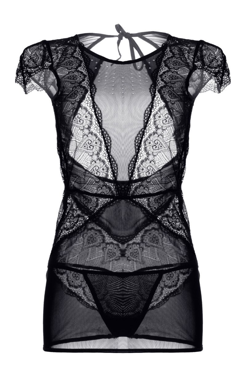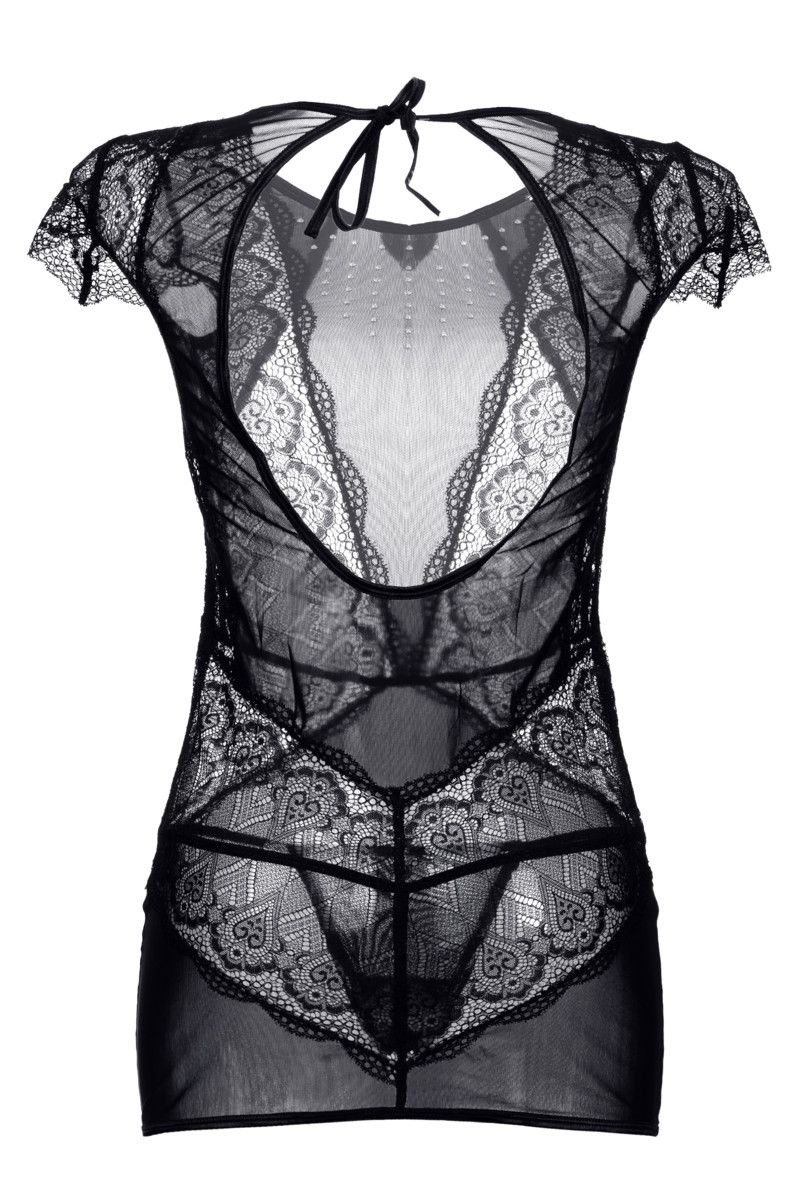 Платье из эластичной сетки с шикарными кружевными вставками, открытой спиной и миниатюрными рукавами. Завязки на шее. Декольте украшено россыпью страз. Т-стринги в комплекте. В комплекте: платье, трусики-стринги.