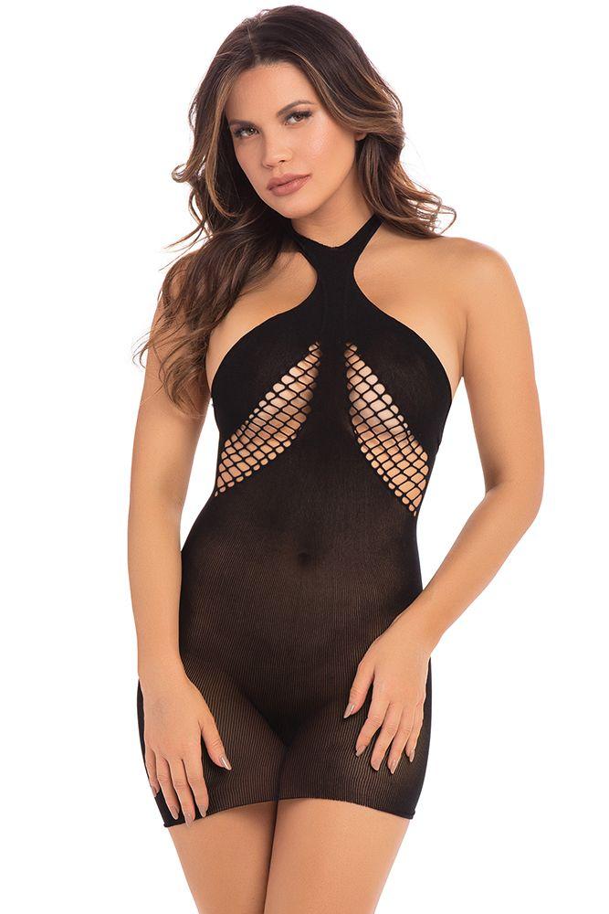 Эротическое мини-платье из полупрозрачного трикотажного полотна с вставками в сетку. Завязки вокруг шеи.