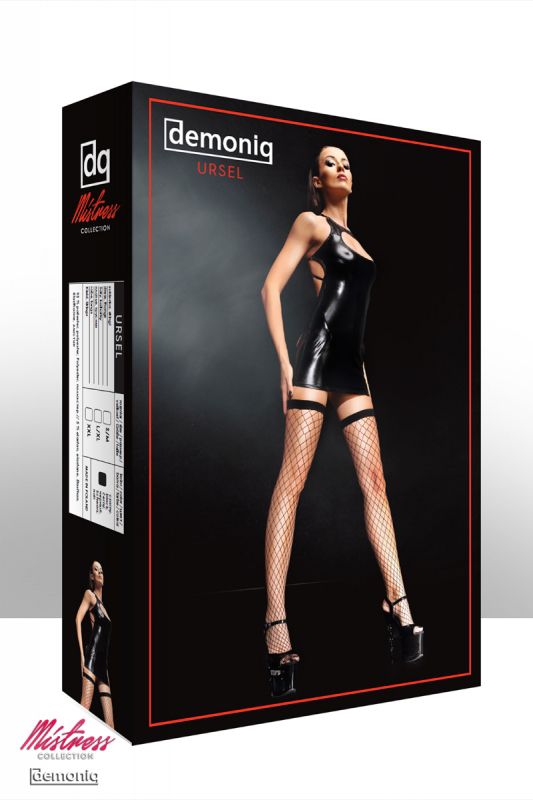 Комплект Ursel - это сочетание сексуального платья и трусиков. Вместе они образуют прекрасную комбинацию, которая точно определит кто в Вашей игре главный. Платье притягивает взгляд к декольте и ягодицам, а спину красиво подчеркивает изящное переплетение бретелей. Эластичные ткани и правильное лекало делает посадку этого платья идеальной, превосходно подчеркивая форму и изгибы женского тела. Ursel сделан из черного глянцевого эластичного материала под «кожу» с мокрым эффектом, который не деформируется при ношении и выразительно подчеркивает обтянутую грудь и бедра. В комплекте: платье, трусики-стринги.