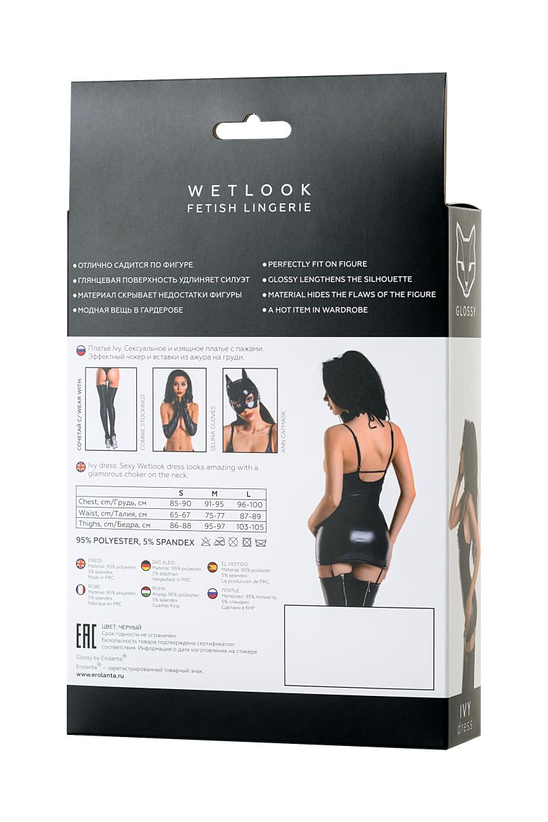 Платье с чокером Ivy из материала с мокрым блеском. Отлично садится по фигуре. Глянцевая поверхность визуально удлиняет силуэт. Плотный материал скроет мелкие недостатки фигуры. Модная вещь в сексуальном и базовом гардеробе. Платье Ivy из материала Wetlook. Ажурная окантовка в зоне декольте образует сексуальный чокер на шее.