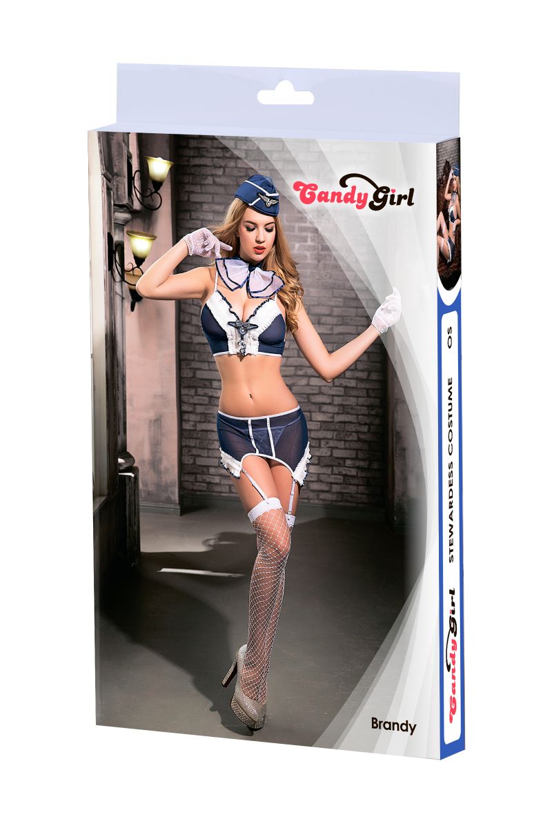 Топ из трикотажной сетки с контрастной отделкой зрительно добавляет объем груди, юбка-пояс для чулок с пристегивающимися пажами акцентирует внимание на бедрах. Заколку с лентой авиакомпании и металлическими цепочками можно отстегнуть. Пара невидимок для волос поможет закрепить головной убор. Галстук на застежке-липучке, чулки из крупной сетки с эластичной резинкой и уплотненными носочком, сеточные перчатки и трусики-стринги. В комплекте: топ, трусы, пояс для чулок, галстук, перчатки, чулки, головной убор.