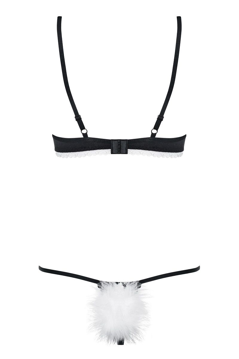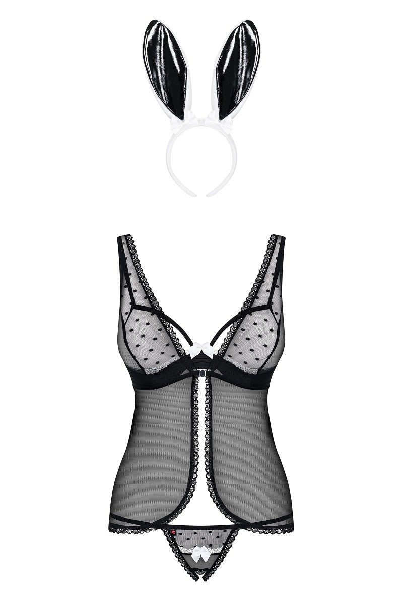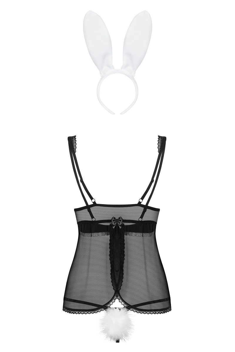 Прозрачная сетка, украшенная кружевами, пикантные, открытые чашки бюстгальтера с регулируемыми бретелями, игривые уши зайца на ободке и crotchless-стринги со съемным кроличьим хвостом. Сочетайте эти четыре предмета между собой и Вы получите целое эмоциональное приключение! В комплекте: сорочка, бра, трусики-стринги, ушки.