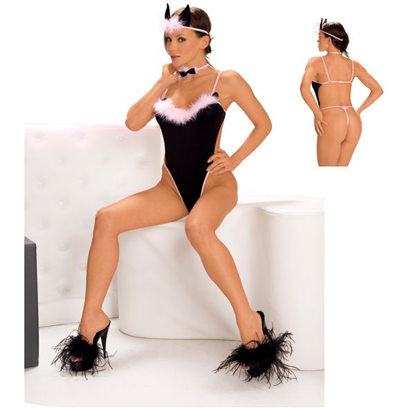 Костюм кошечки: боди с опушкой на груди с розовым кантом, на тонких бретельках и с пушистым хвостиком, бантик на шею, повязка на голову с ушками. В комплекте: боди, бант на шею, ушки.