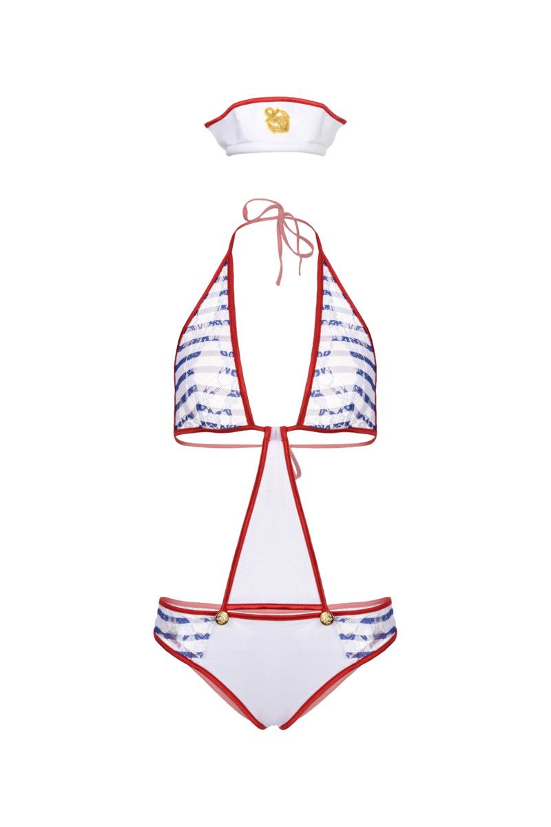 Костюм морячки из 2х предметов: боди-трансформера и головного убора. Внутренняя часть боди отстегивается и получается бикини. В комплекте: боди, головной убор.