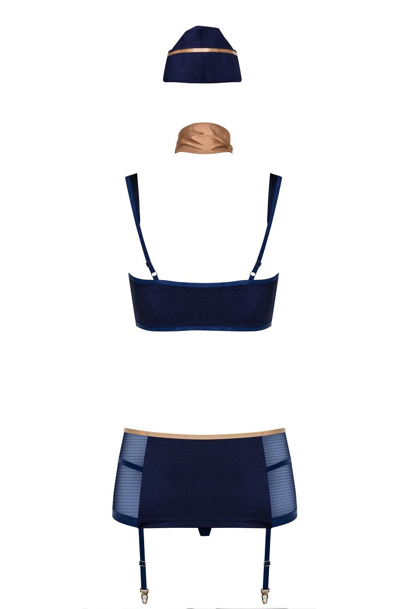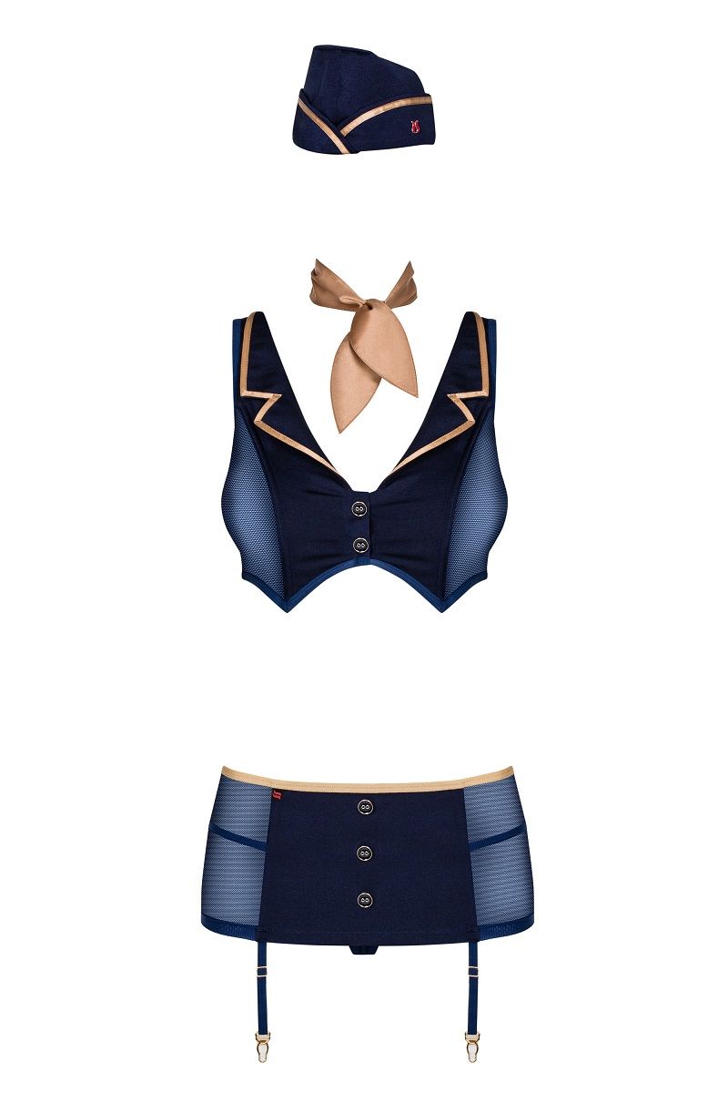 Соблазнительный костюм стюардессы из пяти предметов. Топ с регулируемыми бретелями - идеальная посадка по фигуре. Сексуальный пояс для чулок, с регулируемыми застежками. Декоративные пуговицы на передней части костюма. Очаровательная пилотка и шарфик - дополняют Ваш образ. Трусики-стринги в комплекте. Красивые и эластичные ткани. В комплекте: топ, пояс, пилотка, шарфик, трусики-стринги.