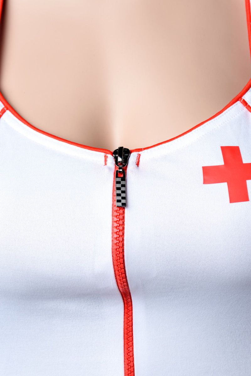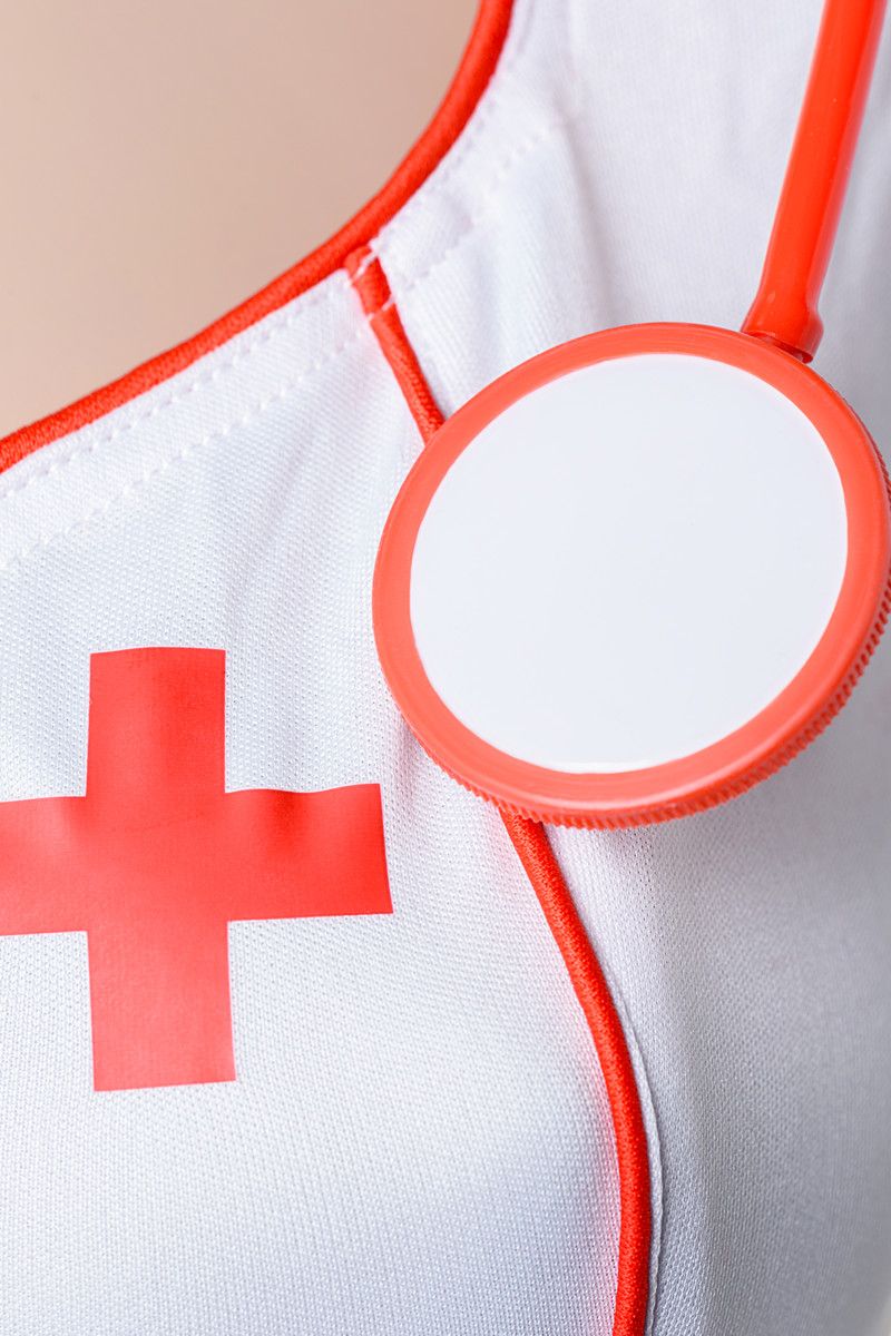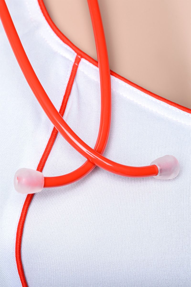 Костюм медсестры: платье на молнии с продольной контрастной отделкой, короткими рукавами и глубоким вырезом. Стринги, ободок и стетоскоп в комплекте. В комплекте: платье, головной убор, трусики-стринг, стетоскоп.