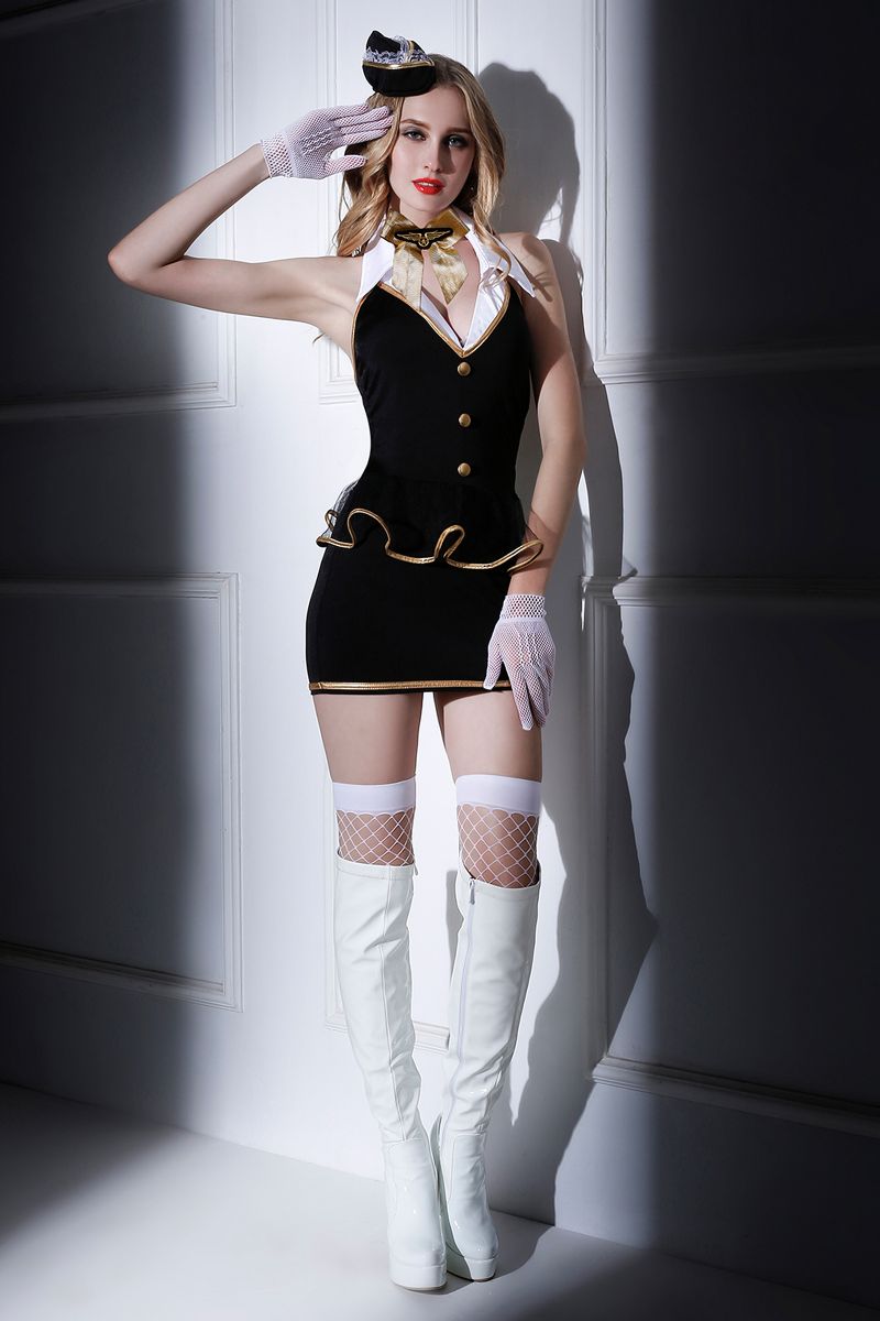 Трикотажное платье с контрастной отделкой, пуговицами, отложным воротником, оборками ниже уровня талии из тонкой сетки смотрелось бы скучно, если бы не открытая спина и ягодицы, которые акцентируют внимание на задней стороне костюма. Дополняющие образ трусики-танга украшены аппликацией-самолетом. Пара невидимок для волос поможет закрепить головной убор. Чокер на застежке велкро с золотым бантом, чулки из крупной сетки с эластичной резинкой и уплотненными носочком и сеточные перчатки сформируют законченный образ. В комплекте: платье, трусики, перчатки, чулки, галстук, головной убор.