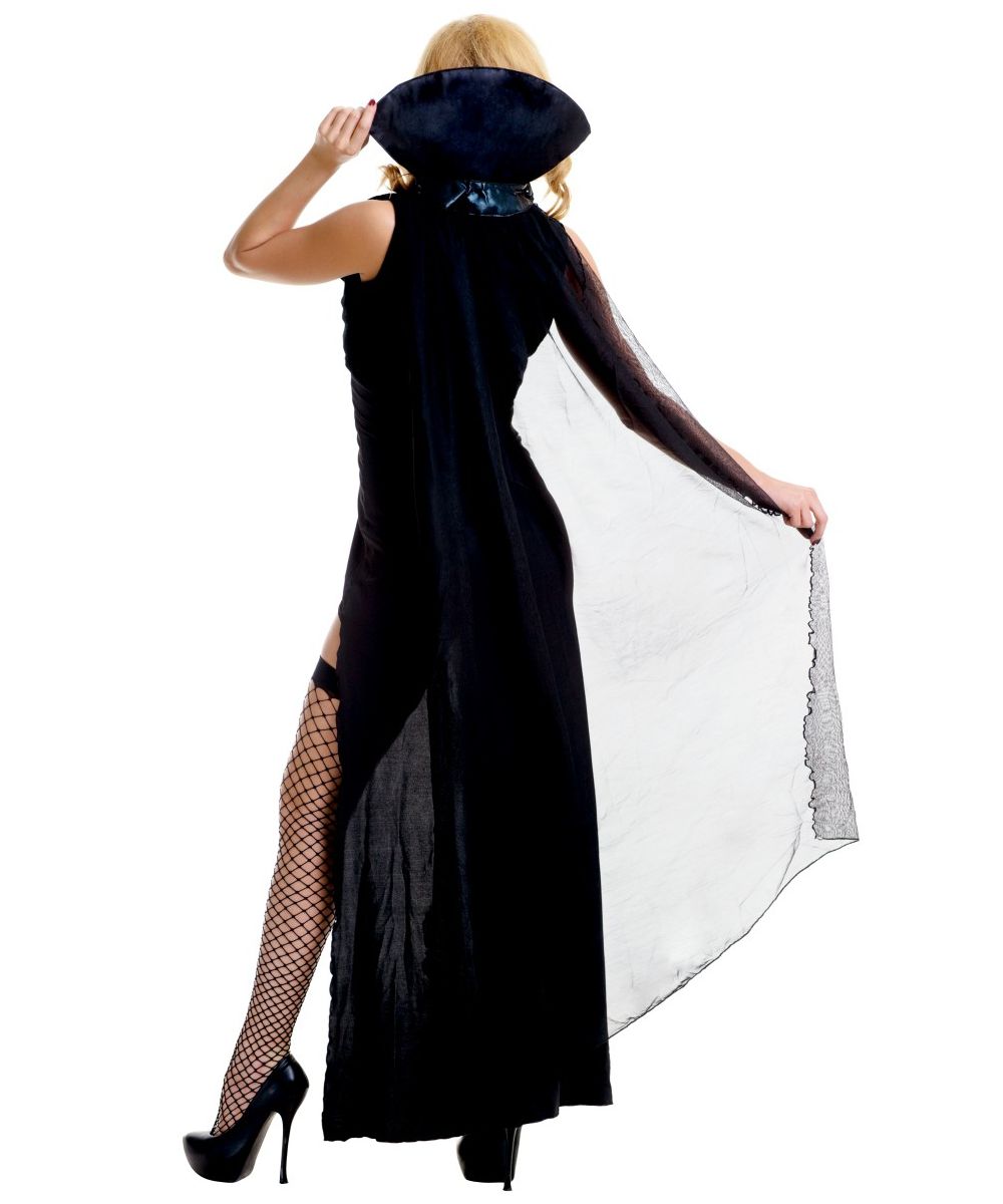 Образ вампира давно сочетает в себе агрессивную сексуальность и смертоносную, мнимую хрупкость. Так будьте же Королевой Ночи на Halloween-party в этом роскошном чёрном костюме! Облегающее платье и накидка с воротником-стойкой подчеркнут вашу независимость, силу и умение быть на высоте. Сегодня только вам решать, какие тёмные фантазии воплощать в жизнь. Костюм состоит из: платья, накидки с воротником, жилета, нарукавников.