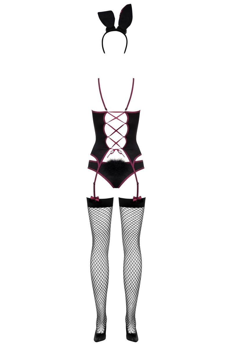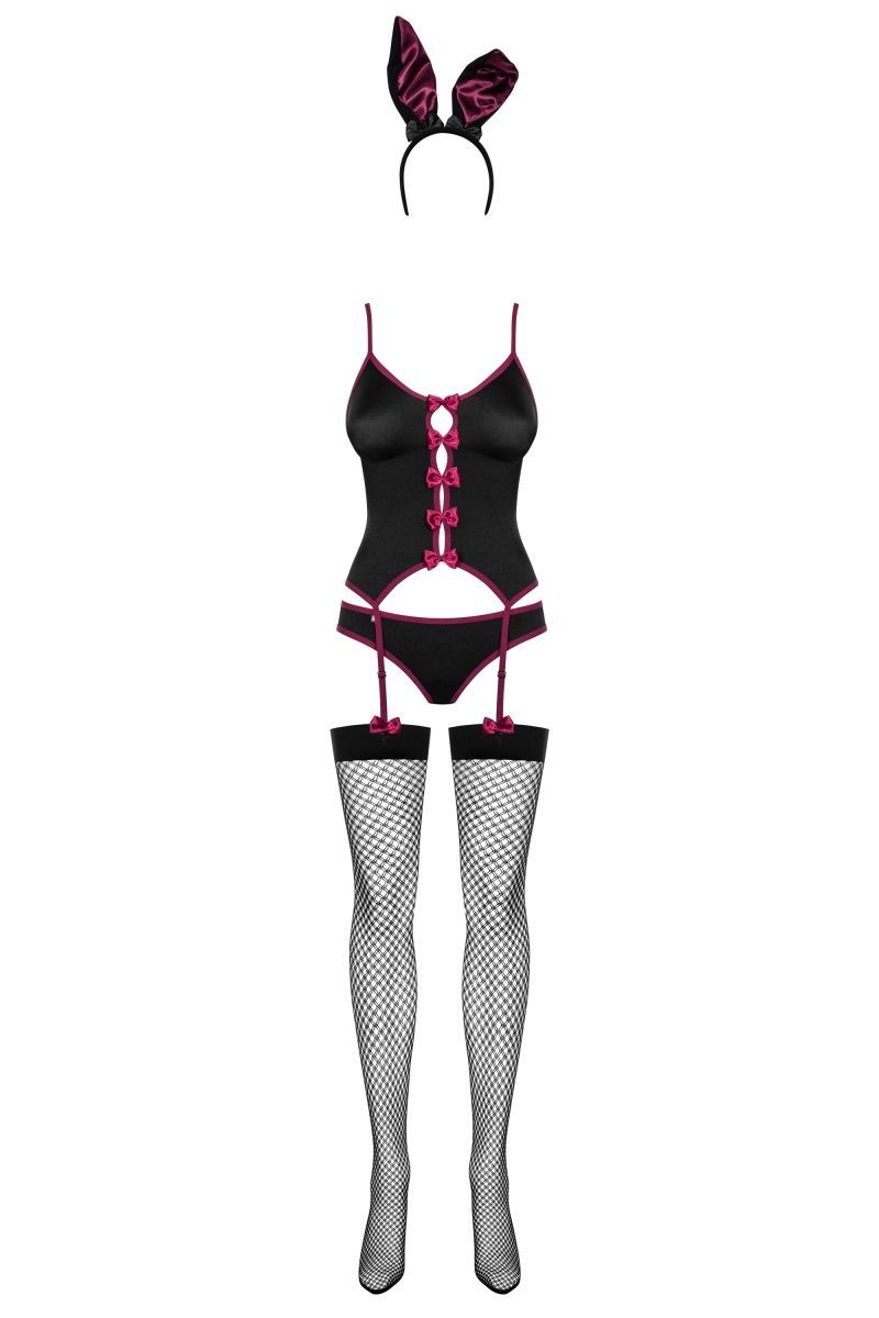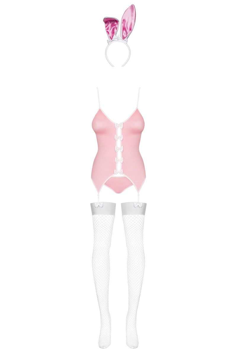 Игривый костюм зайки, в комплект входит корсаж с пажами для чулок, украшенный белыми бантиками, трусики с маленьким хвостиком, ушки и белые чулочки. В комплекте: корсаж, трусики, чулки, головной убор.