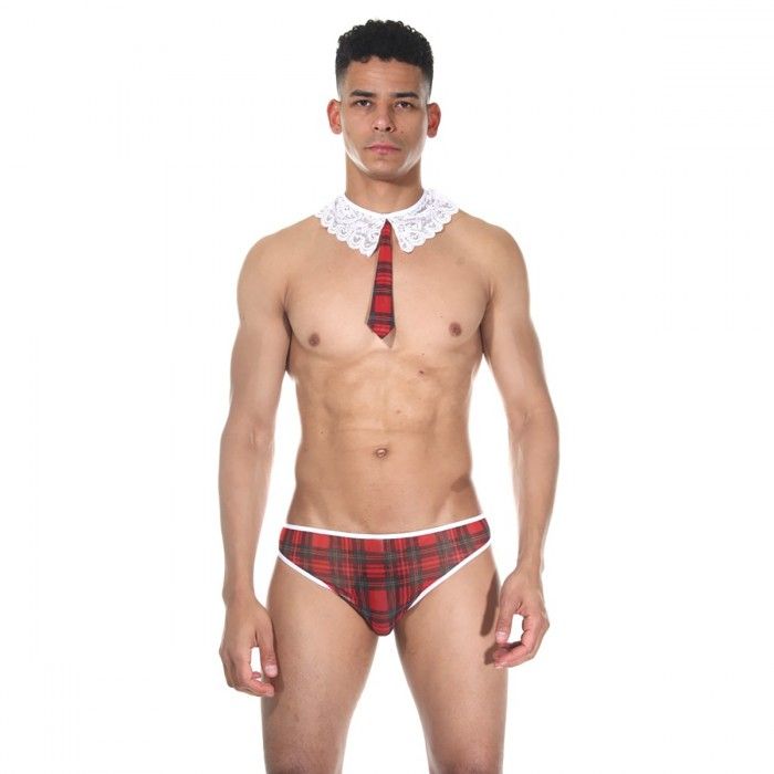 Костюм ученика для мужчин, состоящий из трусов-тонгов в клетку и из белого кружева, и красного клетчатого галстука с белым кружевным воротничком. В комплекте: трусы, воротник с галстуком.