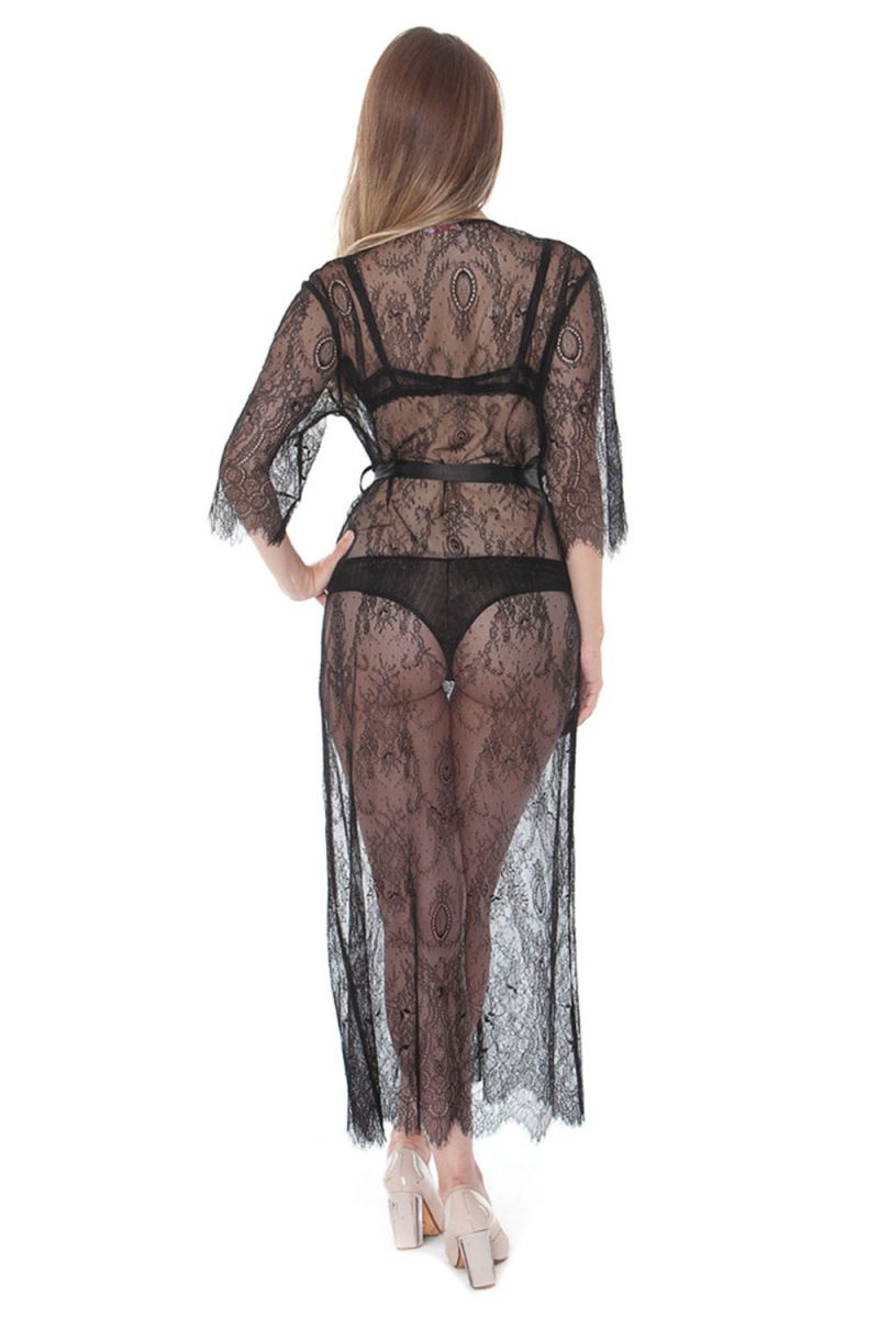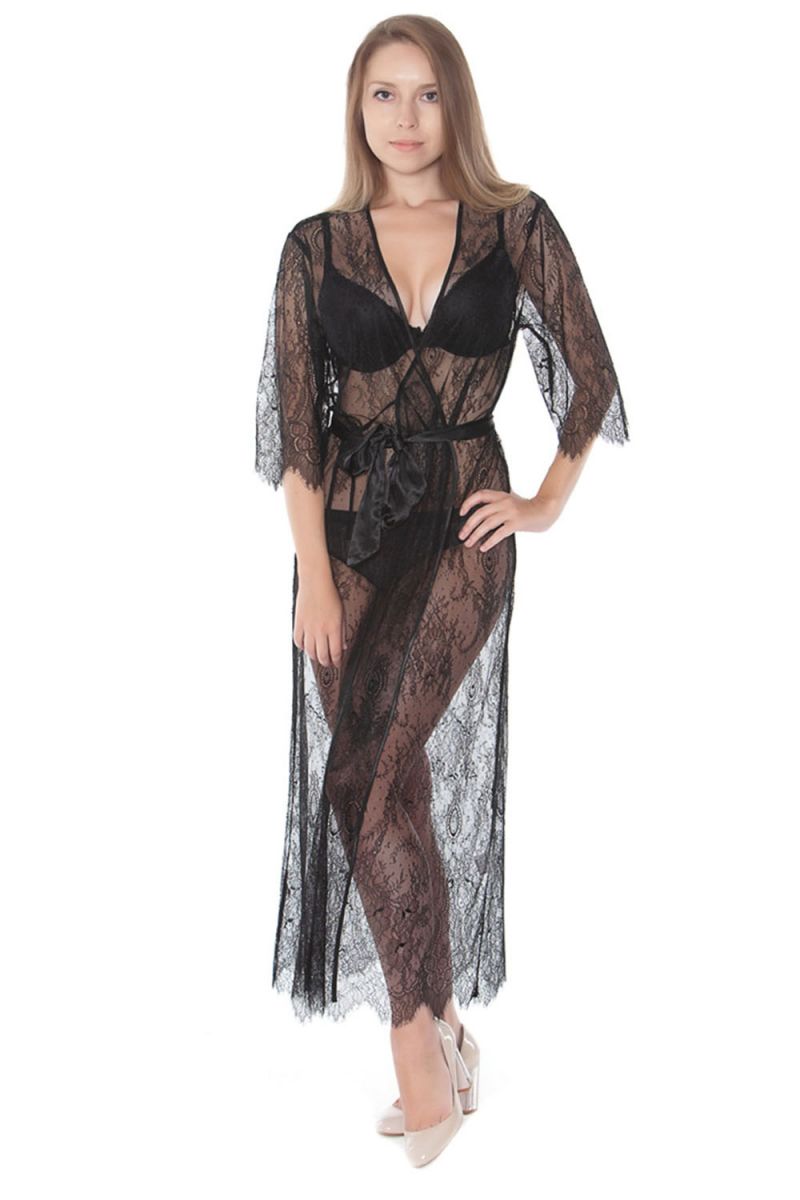 Женский домашний халат выполнен из кружевного полотна. Модель свободного силуэта на поясе. Изделие длиной макси. Борта халата окантованы шелком. Рукав прямой длиной 3/4. Трусики и бюстгальтер не входят в комплект!