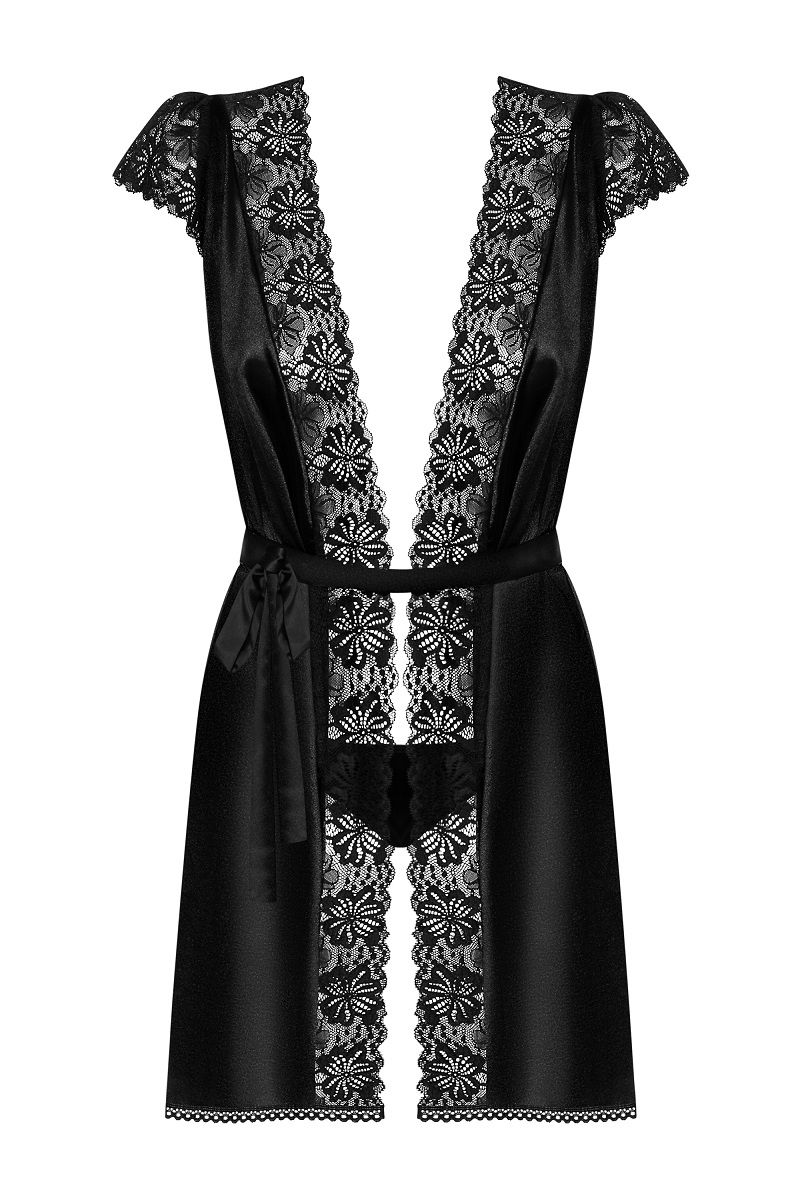 Элегантный пеньюар из стрейч-атласного материала, украшен кружевом, трусики в комплекте. В комплекте: пеньюар, трусики-стринги.