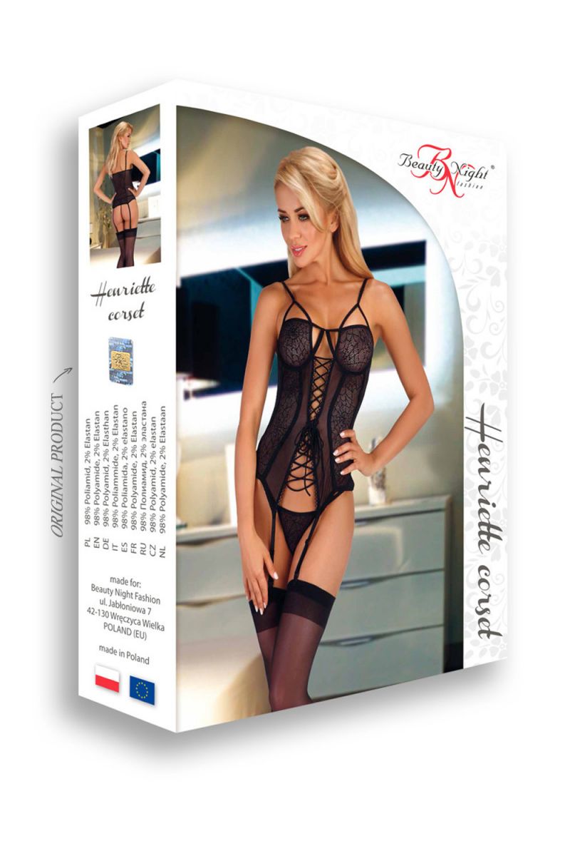 Черный кружевной корсаж Henriette, в комплекте идут стринги. В комплекте: корсаж, трусики-стринги.