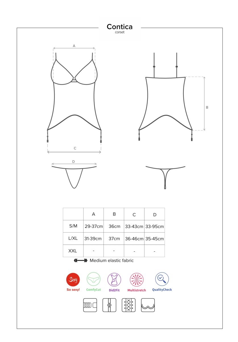 Побалуйте себя кружевными материалами и фантастическим стилем корсажа Contica с трусиками. Мягкие чашки бюстгальтера и нежная прозрачная сетчатая ткань подарят вам незабываемые впечатления. Маленький бантик между чашками бюстгальтера добавит очарования. Супер сексуальная атласная шнуровка ниже бюста согреет его чувства. Не волнуйтесь, он согреет вас позже... В комплекте: корсаж, трусики-стринги.