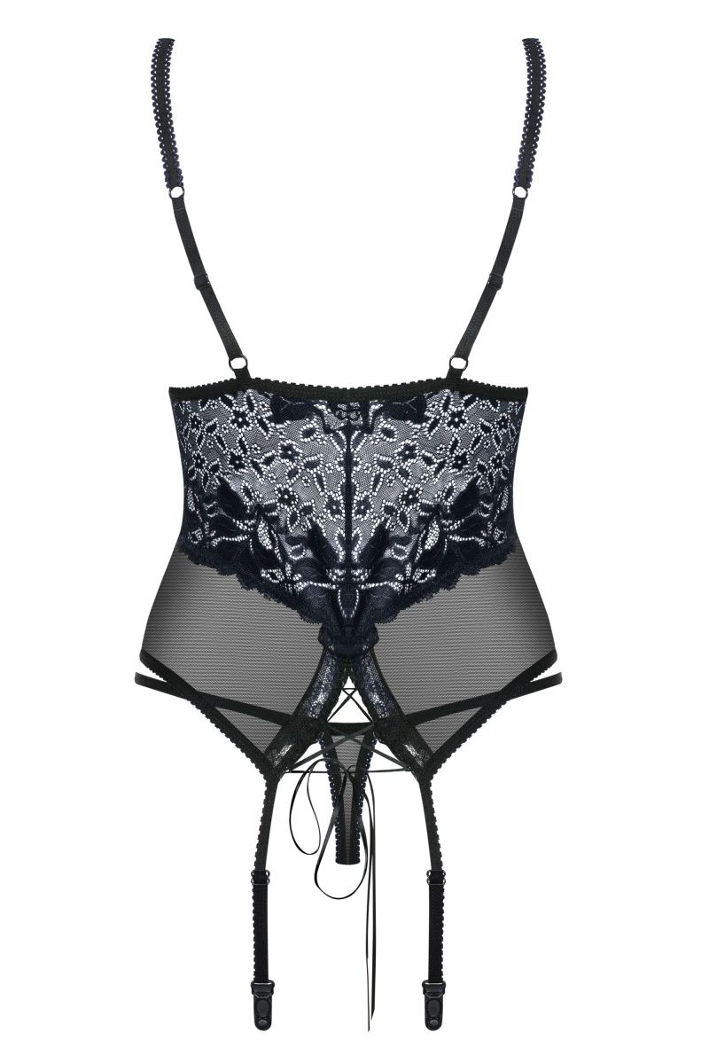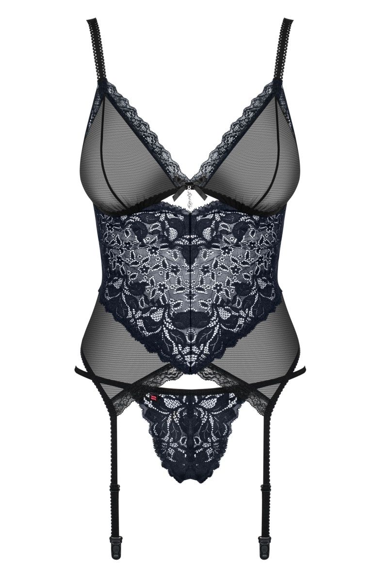 Эротический корсаж выполнен из прозрачной сеточки и темно-синего кружева, бретели регулируются. В комплекте: корсаж и трусики-стринги.