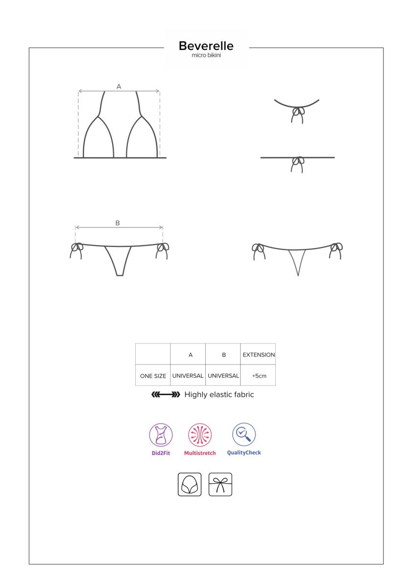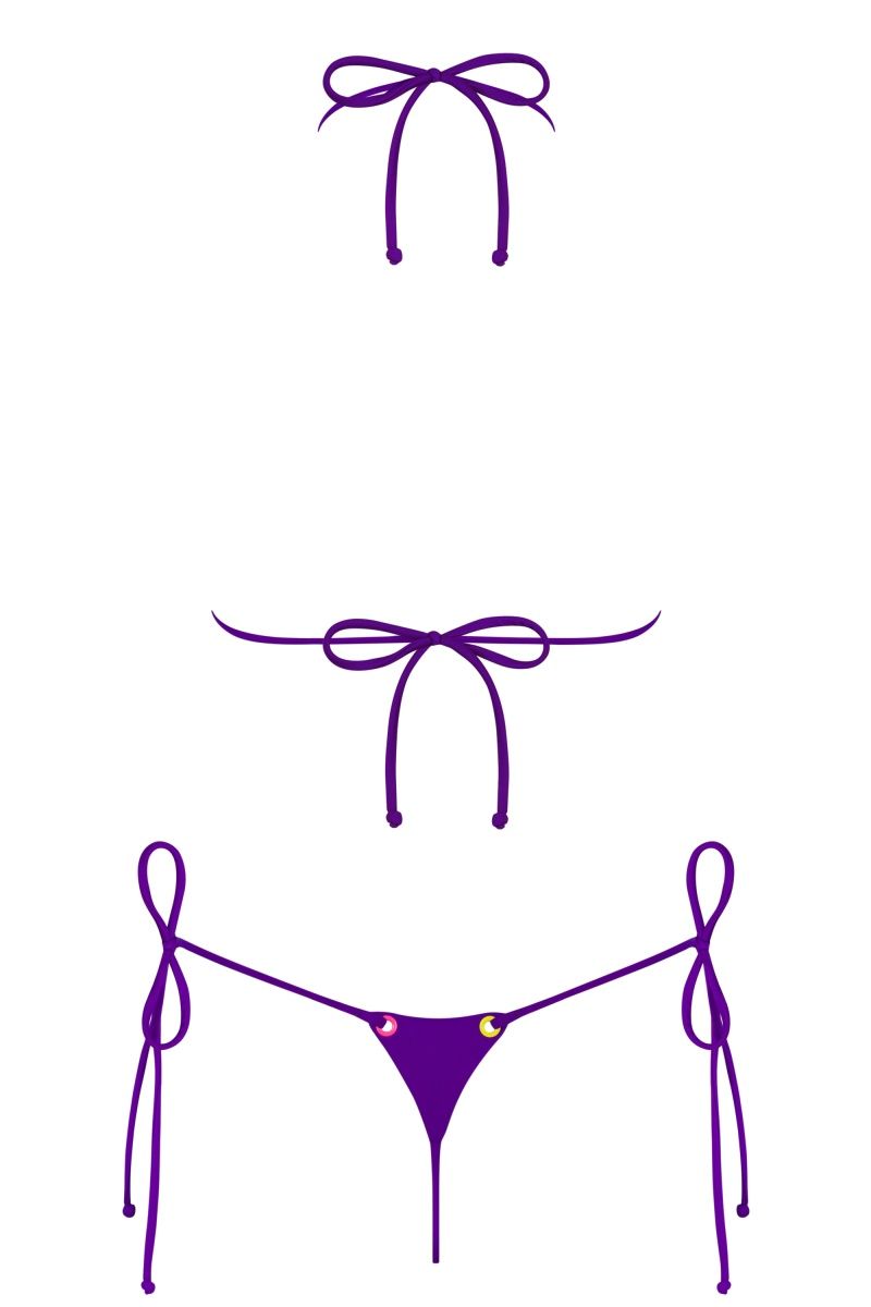 Миниатюрный и максимально открытый купальник микро-бикини Beverelle. Лиф выполнен из мягких треугольников, фиксируется тонкими завязками на шее и спине. Изящные плавки-стринги с низкой посадкой и завязками по бокам. Загар в таком купальнике получится максимально красивым и ровным. В комплекте: лиф, трусики.