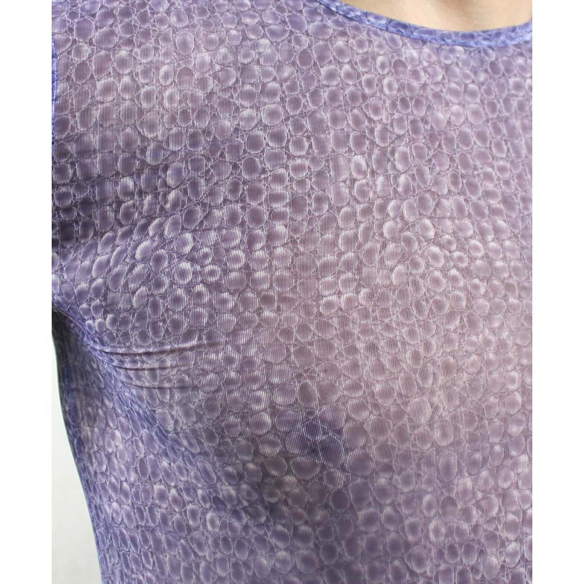 Фиолетовая облегающая футболка с рисунком-ячейками.