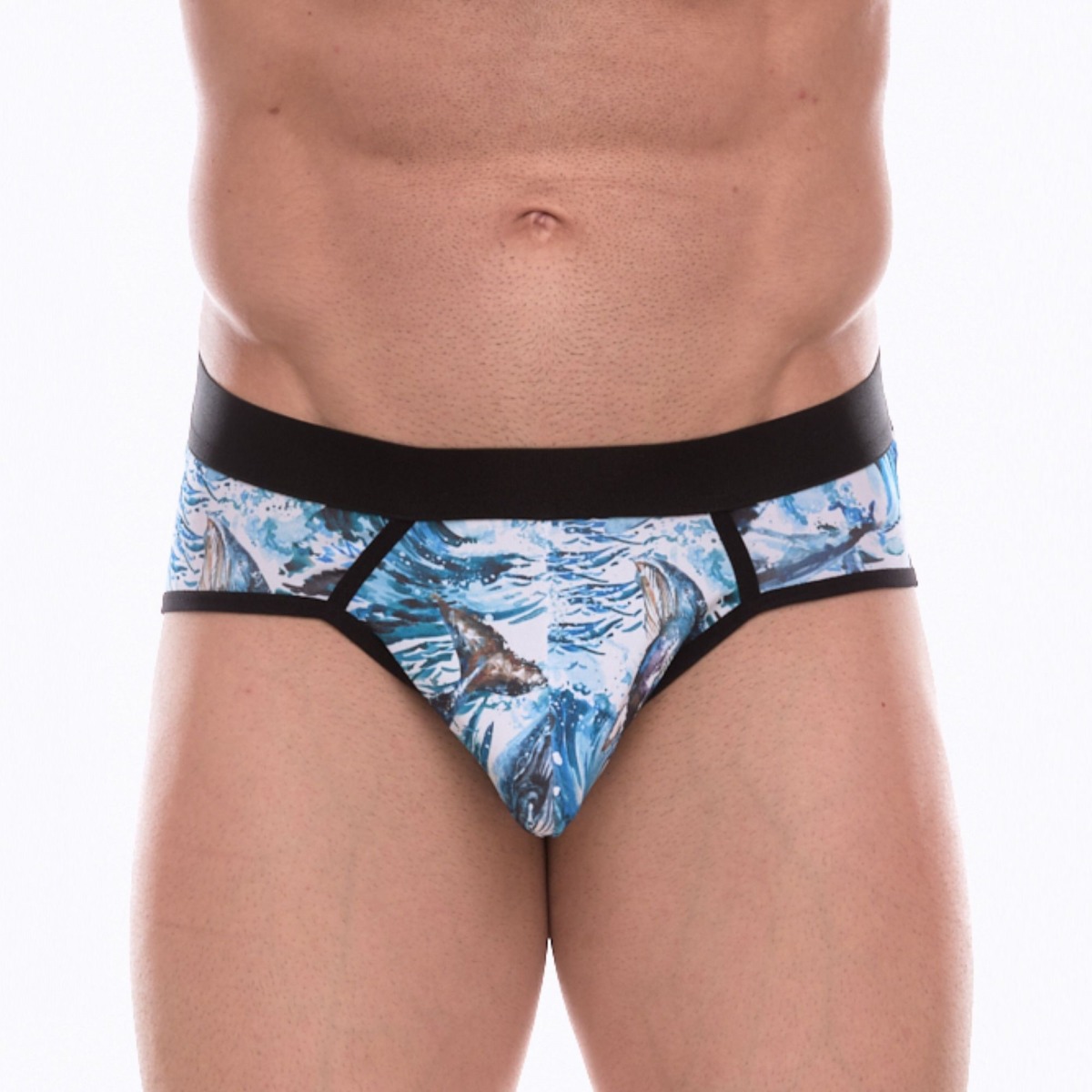 Мужские трусы-стринги с принтом в виде китов в волнах.Характеристики